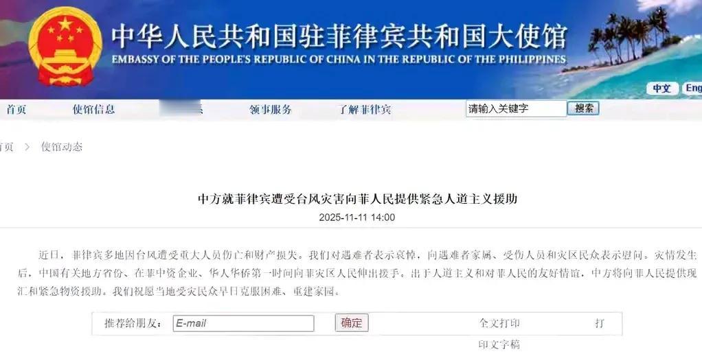 中方将向菲律宾提供救灾援助! 11月11日,中方驻菲律宾大使馆发布消息称,由于菲