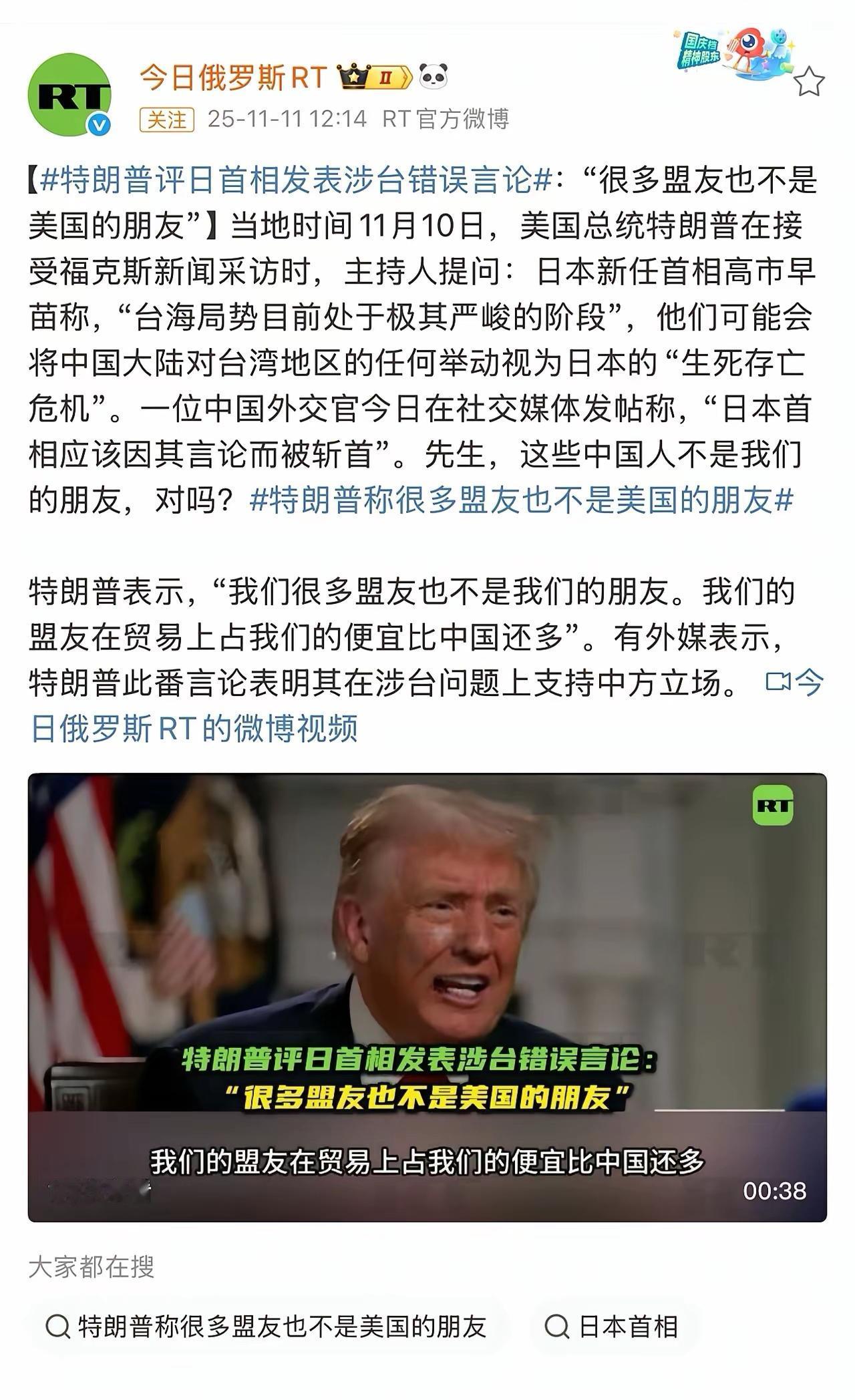 对于本子女首相的不识时务,懂王感到特别不满意。 所以在记者想引导他发表支持高市的言论时懂王直接说出了:很多盟友也不是我们的朋友,我和中国有很好的关系。 网友爆料:懂王已经做好了四月份来中国大出风头的准备,他不允许有人破坏。 高市在得知情况后今天改口:不作为政府统一观点提出。 当今世界是靠实力说话,高市早苗选错了对象。