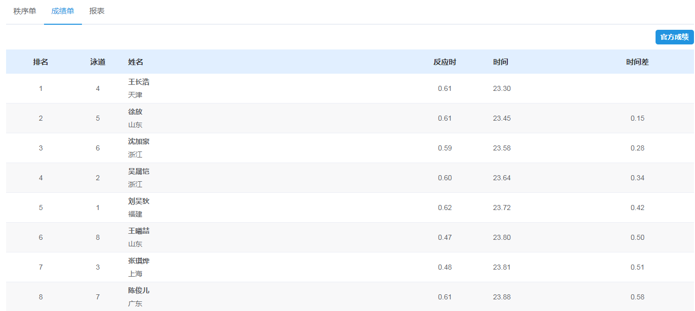 山东队的徐放23秒45获得银牌,浙江队的沈加豪23秒58,刷新个人最好成绩获得铜牌。