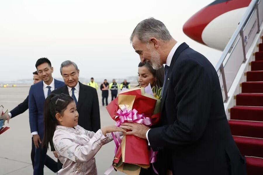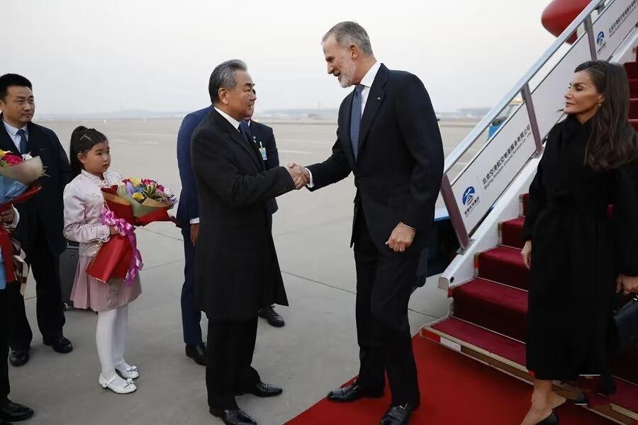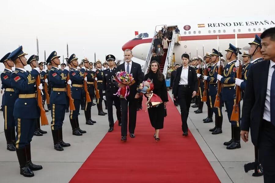 西班牙王后抵达北京,穿风衣与裙子走机场红毯,随行女保镖太飒了!11月11日西班牙