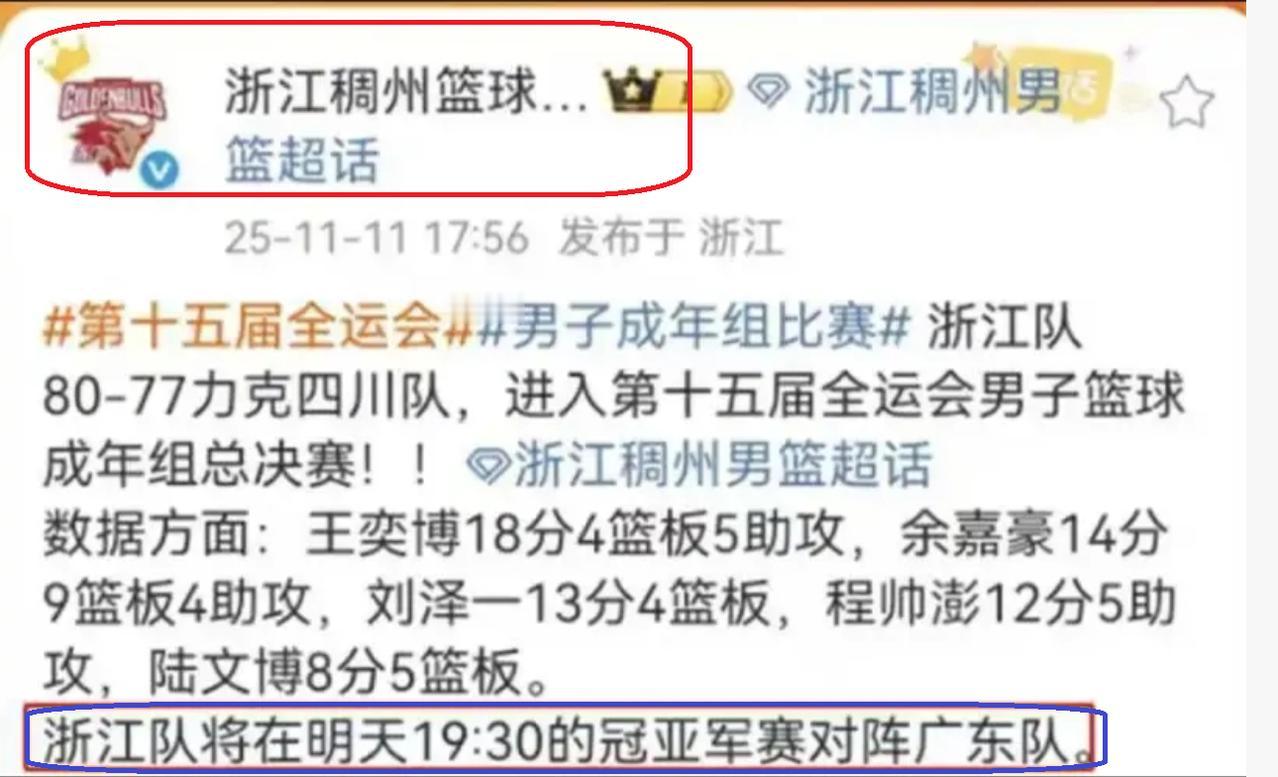 浙江队太有意思!广东队与辽宁队比赛还没有打,就宣布决赛对手了,球迷:是自信,还是…… 全运会男篮半决赛,浙江队爆出了一大冷门,以80-77击败了争冠大热门四川队。如此一来,浙江队闯进了全运会决赛,他们将会与广东队、辽宁队胜者争夺冠军。而四川队则无缘争夺冠军,只能是争第三名。有意思的是,在前段时间,四川队主力后卫孙铭徽就表示,球队的目标是前三名。如今,四川队真的是只能争第三名了。 其实,对于这场比赛,在赛前,很多球迷都是看到四川队能够赢球,毕竟,四川队在实力面,明显要高出浙江队,特别是在内线方面,四川队拥有胡金秋+周琦,如此内线组合,可以说完胜任何对手。 然而,面对实力出众的四川队,浙江队没有胆怯,没有放弃,而是通过各种变化,通过全队努力,与四川队形成了僵持状态,并且,通过最后的发力,以3分的优势击败了四川队,创造了一大冷门。 随着击败四川队,浙江队上下也是十分激动,十分开心,全队上下都是在不断的庆祝,庆祝这场来之不易的胜利。 有意思的是,浙江队在庆祝的同时,也是通过球队官网平台发布了好消息,庆祝球队闯进全运会决赛。然而,浙江队十分有意思地道出了决赛的对手,没错,他就是东道主广东队! 但是,广东队与辽宁队的比赛还没有打,这也相当于浙江队提前公布了决赛的对手。假如,辽宁队能够击败广东队闯进决赛,那么,浙江队如此宣布,是否有点…… 当然了,从浙江队如此宣布决赛对手,也充分说明了,球队真的是太激动,太开心了!哈哈!