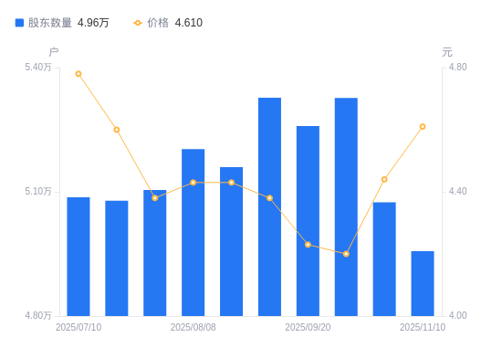 日期A股户数(户)流通A股户均持股数(股)户均持股市值(万元)2025-11-104956549270.3322.712025-10-315074948120.8321.372025-09-305326545847.8219.262025-09-205258646439.8119.642025-09-105327345840.9320.082025-08-205159547331.8020.972025-08-085203146935.1720.792025-07-315104347843.6620.962025-07-205078748084.8322.122025-07-105086748009.2022.95