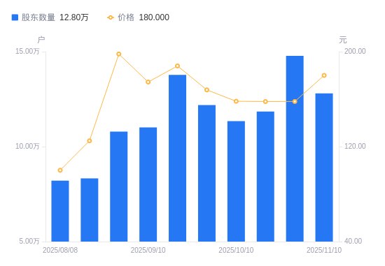 日期A股户数(户)流通A股户均持股数(股)户均持股市值(万元)2025-11-101280196060.45109.092025-10-311477595250.8082.972025-10-201184666549.16103.462025-10-101134506838.72108.192025-09-301219196363.67106.782025-09-191377555632.12105.872025-09-101100887047.57122.922025-08-291079127189.68142.382025-08-20832609318.43116.412025-08-08821189448.0294.57