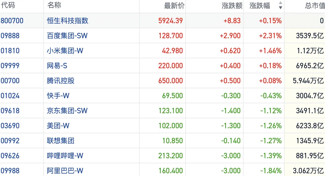 盘面上,今日大型科网股涨跌不一,百度涨2.3%,小米涨1.46%,阿里巴巴、京东、美团跌超1%。