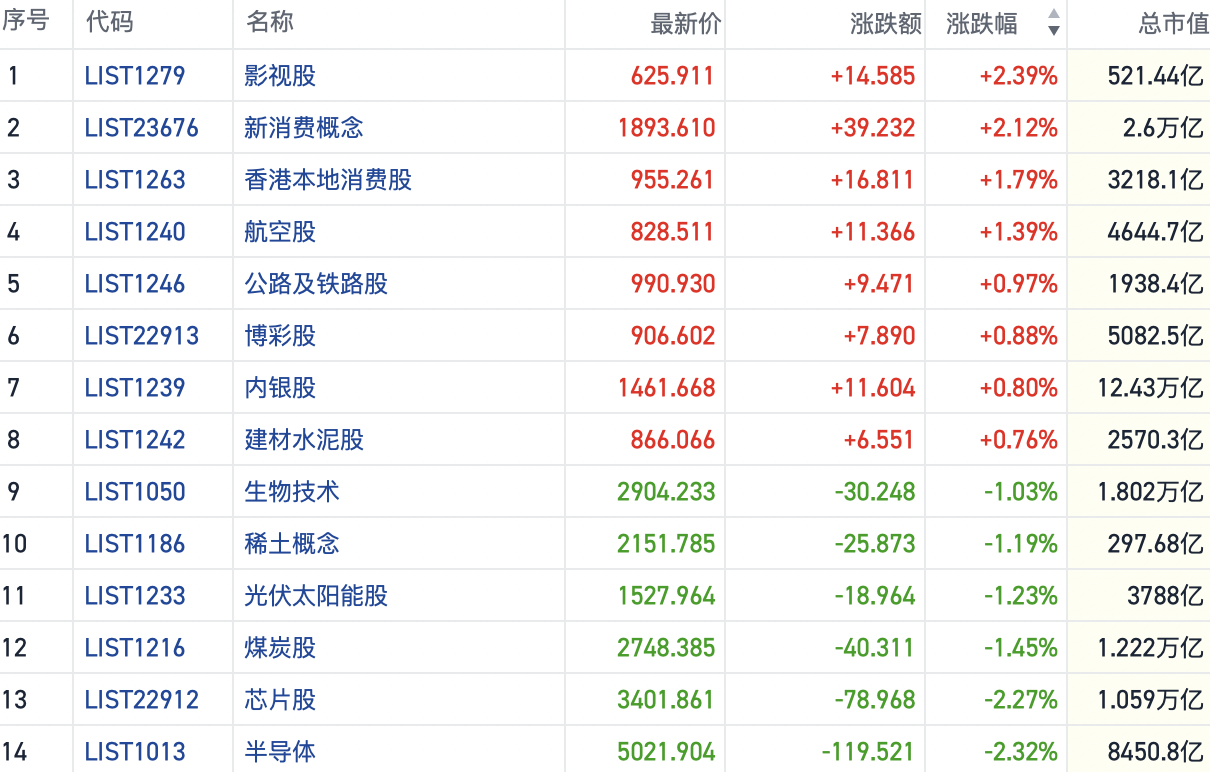 其他方向上,消费板块整体延续短线活跃度,餐饮、零售等行业齐涨,影视股也出现冲高行情。此外,机器人、AI等方向热度回暖,航空、地产、博彩、基建股齐涨。