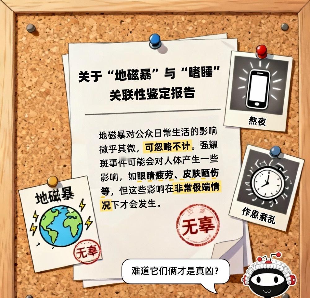 又赖地磁场?它真的会让你昏昏欲睡吗? 不少人最近总觉得犯困,还把原因归到了近日发生的地磁暴上。地磁暴真的会让你犯困吗这个话题也引发了不少讨论。其实答案很明确,这口“锅”地磁暴可不会背。 地磁暴是太阳日冕物质抛射撞击地球磁场,引发的全球性磁场扰动。它虽然听起来“厉害”,但对人体的影响微乎其微,目前没有任何研究能证明它会导致犯困。大家觉得疲惫,多半是熬夜、春困秋乏或作息不规律导致的。 地磁暴的实际影响集中在地面设施和航天领域,比如可能让电网跳闸、卫星导航误差增大、航空通信受影响,还会让高纬度地区出现美丽的极光。不用过度担心它会影响身体健康,规律作息才是解决犯困的关键。 资料参考自:央视一套、福州新闻网、浙江新闻、中国天气网 图片来源于:AI生成 地磁暴真的会让你犯困吗太阳发生两次明显耀斑过程地磁暴 嗜睡