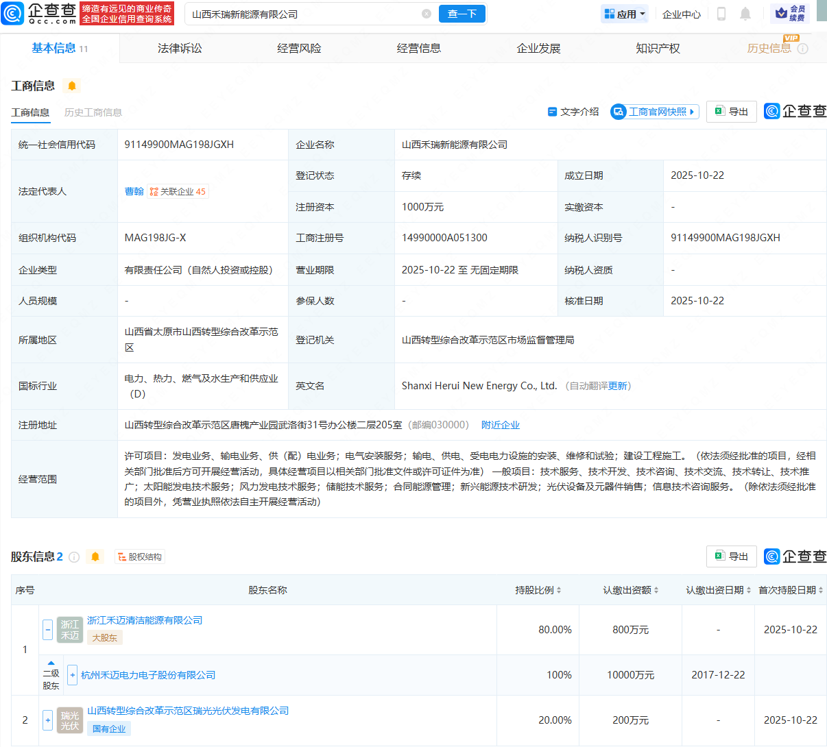 企查查APP显示,近日,山西禾瑞新能源有限公司成立,法定代表人为曹翰,注册资本为1000万元,经营范围包含:发电业务、输电业务、供(配)电业务;电气安装服务;储能技术服务;光伏设备及元器件销售等。企查查股权穿透显示,该公司由禾迈股份(688032)全资子公司浙江禾迈清洁能源有限公司、山西转型综合改革示范区瑞光光伏发电有限公司共同持股。