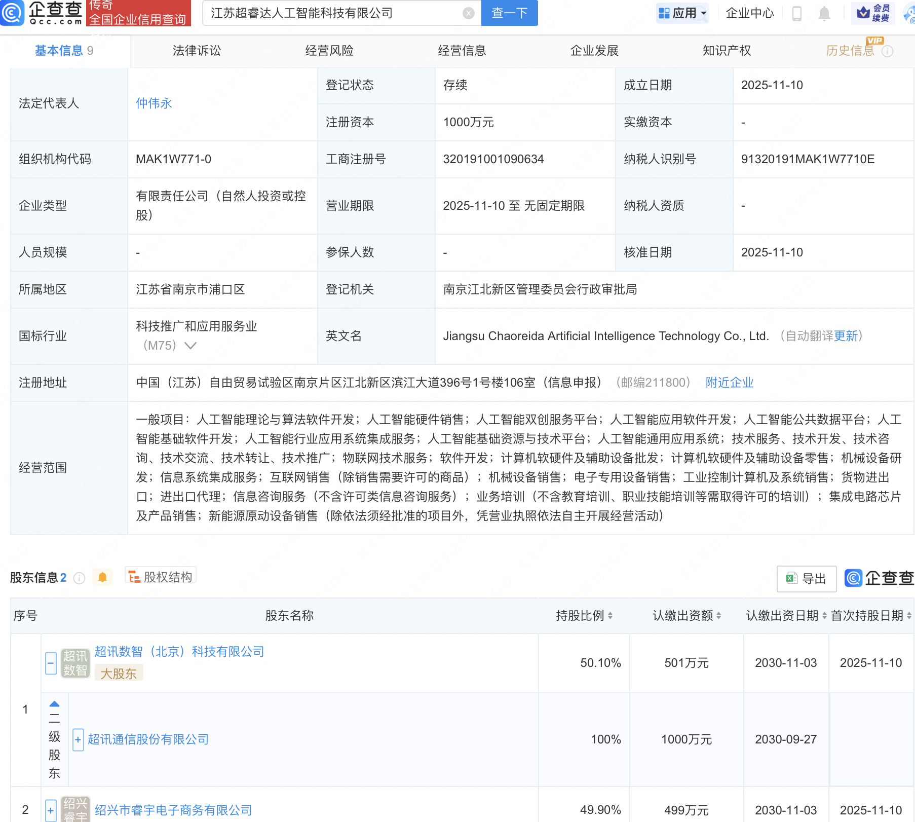 企查查APP显示,近日,江苏超睿达人工智能科技有限公司成立,注册资本1000万元,经营范围包含:人工智能理论与算法软件开发;人工智能硬件销售;人工智能双创服务平台;人工智能应用软件开发等。企查查股权穿透显示,该公司由超讯通信(603322)全资子公司超讯数智(北京)科技有限公司等共同持股。