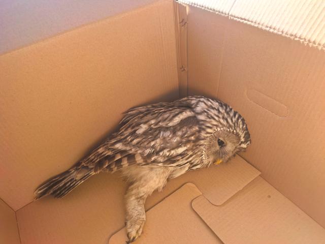 6日,爱辉边境派出所辖区护边员在瑷辉镇知青馆附近巡逻时发现,一只棕褐色形似猫头鹰的鸟类趴伏在地:羽毛蓬松颤抖不止,嘴部沾有血迹,扑腾翅膀却无法升空。群众第一时间拨打报警电话,民警赶赴现场查看后,基本确认这只受伤的猫头鹰是国家二级保护动物长尾林鸮。为避免直接触碰加剧伤情,民警找来纸箱,轻手轻脚将其罩住,小心护送其前往野生动物救助站。