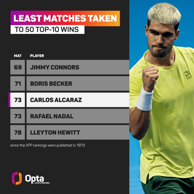 据统计,阿尔卡拉斯仅用了73场比赛(对阵TOP10)就赢下对世界前十的第50胜,是ATP创立排名系统以来第三快达成这一成就的球员: