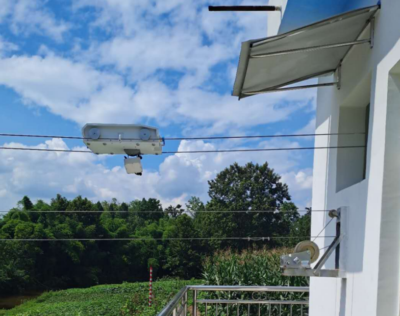 水文测流缆道的结构体系围绕核心功能科学构建,缆道基础选用直径 6mm 的 304 不锈钢钢丝绳作为导轨,两根导轨间距固定为 330mm,一端锚定在设备安装房或专用机箱内,另一端延伸至河对岸并通过转向轮与水泥配重块连接,100m 跨度缆道需配置 500kg 左右配重以维持导轨稳定性。运行车作为核心执行单元,集成雷达流速仪、伺服电机、测速控制器及锂电池等关键组件,通过驱动轮悬挂于导轨之上,采用双轨全自动运行模式保障移动精度。控制及传输系统具备参数配置、数据处理与远程传输功能,支持多通讯方式与存储扩展,为系统自主运行提供技术支撑。