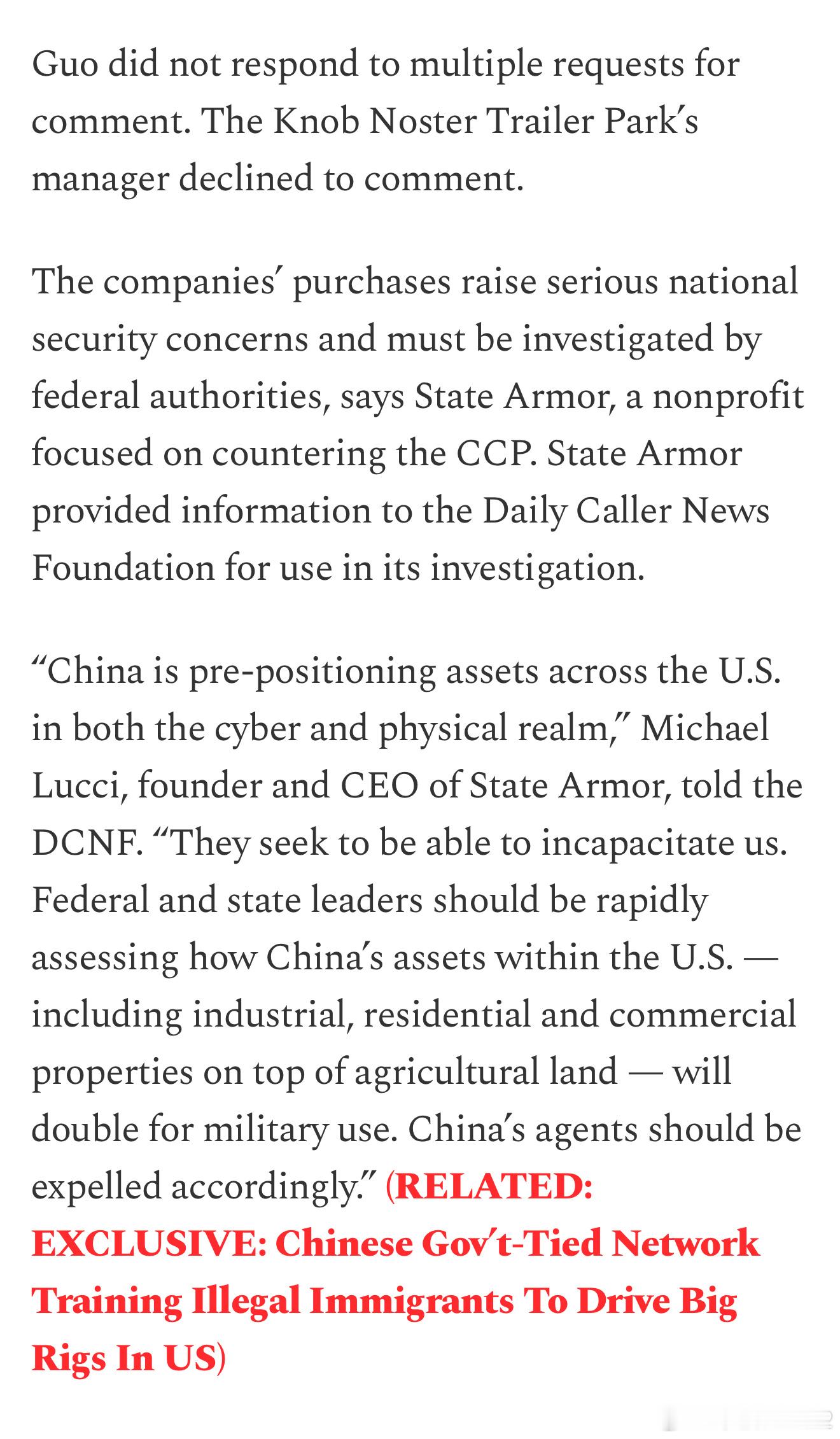 Daily Caller昨天发表了一篇长篇调查报告。众所周知,轰炸伊朗核设施的B2战机是从密苏里怀特曼空军基地起飞的,该基地边上是一座房车公园,二者不仅共享围栏,而且公园与飞机跑道只隔一英里。而该公园的所有者是两位居住在加拿大的华人,且与纽约18楼那位有密切关系。我只能说到这儿,有兴趣的同学自己去阅读。