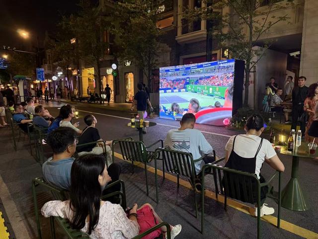 国庆假期晚间,茂名北路限时步行街露天转播上海网球大师赛。叶宇摄