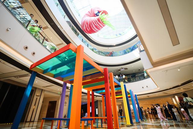 兴业太古汇布置的艺术展览,吉利克标志性的极简装置化作色彩斑斓的“社交浮岛”。海沙尔摄