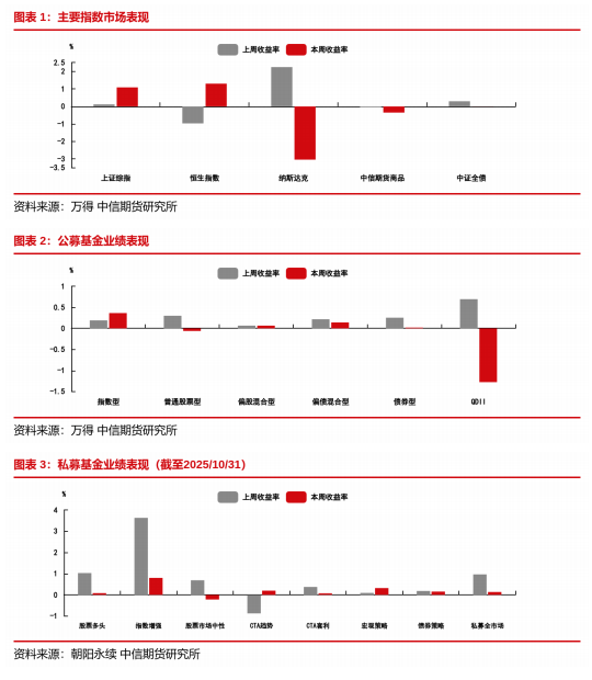 重点关注:上周权益市场呈现高位震荡,市场风格呈现哑铃型特征。私募基金策略表现方面,截至10月31日,量化超额继续修复,市值因子带来较强正贡献,小市值股票活跃度开始走强。市场结构分化减弱,股票市场中性策略多头端受益于超额环境正向修复,对冲段基差小幅扩大,后市表现可以期待。宏观策略方面,受美国政府停摆影响,叠加中美关系缓和短期内各资产相关性有所减弱,维持震荡行情。商品市场方面,受各品种反转行情影响,CTA趋势中偏短周期表现相对更好,套利相对更偏稳定防守风格。综合而言,近期市场震荡加剧,风格较前期走向均衡,量化指增超额环境较好,推荐关注;同时,可适当布局CTA趋势策略。