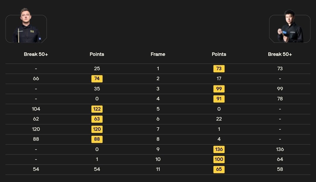 全场比赛赵心童打出一杆破百(136)和五杆50+(73、99、78、64、58),威尔逊打出两杆破百(104、120)和四杆50+(66、62、88、54)。