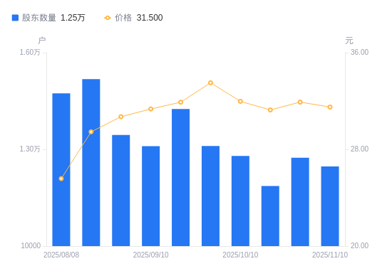 日期A股户数(户)流通A股户均持股数(股)户均持股市值(万元)2025-11-101247232521.69102.442025-10-311274031837.56101.592025-10-201186234194.11106.892025-10-101279531700.70101.352025-09-301310530950.82103.722025-09-191425128461.9090.802025-09-101310030962.6397.042025-08-291344730163.6492.612025-08-201517826723.5878.702025-08-081473627525.1470.41