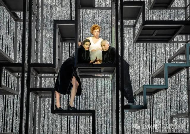 舞台的深处,几盏裸露的灯光透过高耸入顶的脚手架,如探照灯般直射观众;光线在钢架结构的阴影间闪烁。而在这些巨大的冰冷的工业钢结构前,轻盈如羽毛,廉价的迪斯科彩带正反射出诱人璀璨的光芒,让我们看到人物或者事实的支离破碎。飘逸缠身的丝带如流光,巨大冰冷的钢结构似桎梏,极大的视觉冲突,当演员的血肉之驱在其间穿梭,上下攀爬,仿佛困兽在牢笼中做着最后的挣扎和狂欢。西岸大剧院昨晚的这一版,由德国布莱希特剧团带来的《三分钱歌剧》的舞台设计,以极简却犀利的视觉语言,直抵布莱希特戏剧的核心,现代人在流光溢彩的囚笼中的思想和生存困境。每个人都在表演,而真相如彩带的反射,只有碎片,永远无法完整呈现。