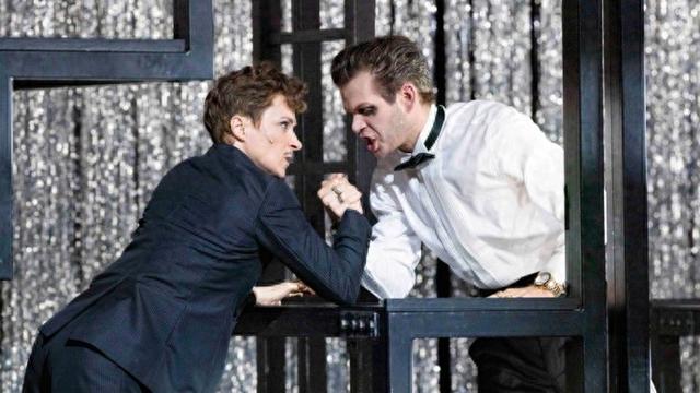 钢架结构在舞台上构建了一个可透视的,无法遁形的现代空间。这些纵横交错的金属线条,既是伦敦房屋的建筑骨架,也可能是监狱的栅栏,更是人和人局促不安的狭小关系,困住的某种身份。此处的钢架将各种无形的牢笼具象化,让观众直观感受到囚禁。而那些一开场满布舞台的发光的彩带,如同精心编织的欲望之网。它们在黑暗中闪烁,以虚假的温暖承诺掩盖整场铁笼的冰冷。这种设计让人自然联想到《卡巴莱》(Cabaret)中那些令人目眩的灯光效果,但此处的彩带更多了一层柔性的束缚意味,它们美丽却缠人,闪耀却短暂,恰如现代人追逐的虚妄梦想。当《海盗Jenny》唱响,那些从彩带反射的光映照在她脸上,仿佛给她戴上了一种神秘的面纱,她以最平静的面部表情唱出最内心澎湃的反差。
