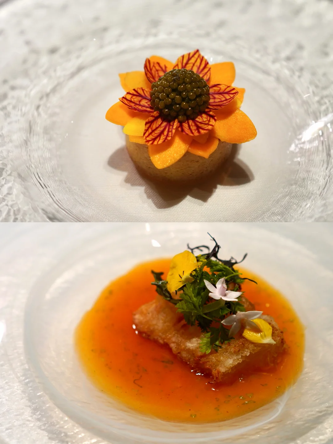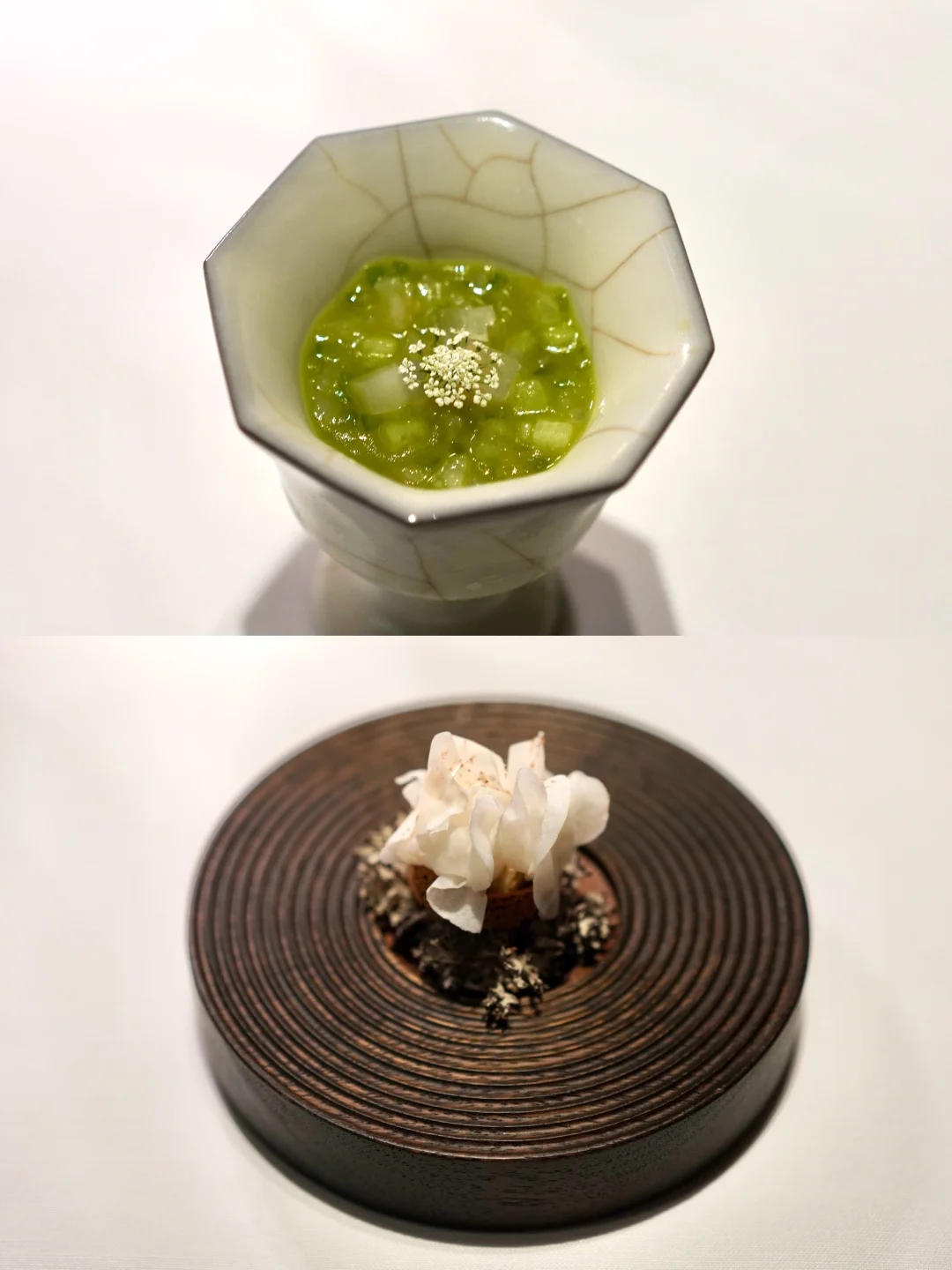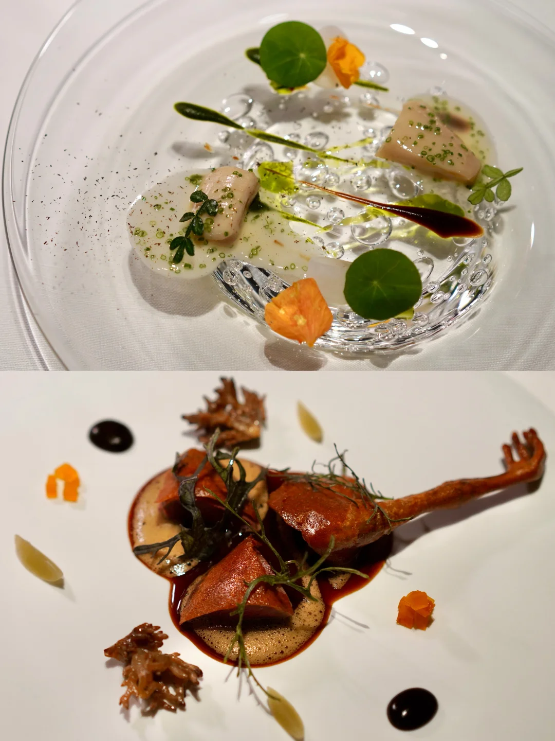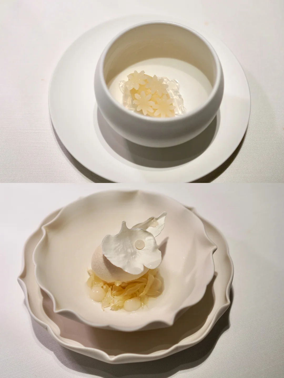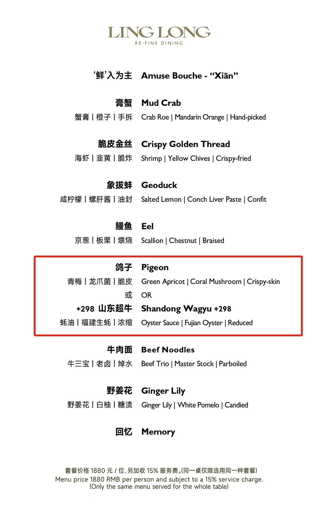 可以说是Ling Long开业以来 最最好吃最印象深刻的一季菜单 选的是最后一张图的菜单 额外加了东风鸡腿(强推一定要加) (另一套菜单属于经典类 里面很多我都吃过) 封顶是脆皮金丝、鸽子、东风鸡腿、牛肉面 这一季的甜品也太出彩了 清爽不腻 天蝎月开始了🔛给我的bro们庆生