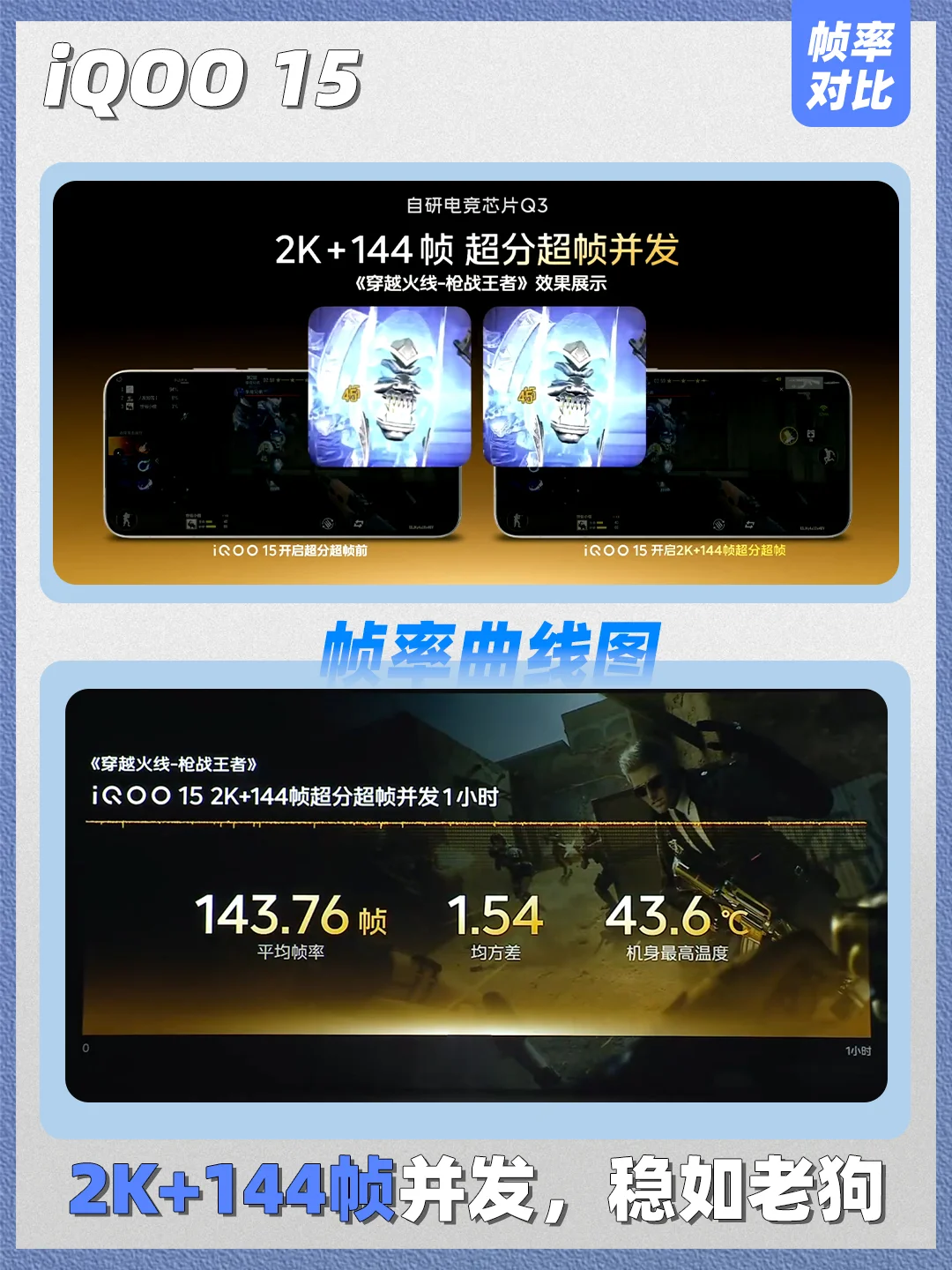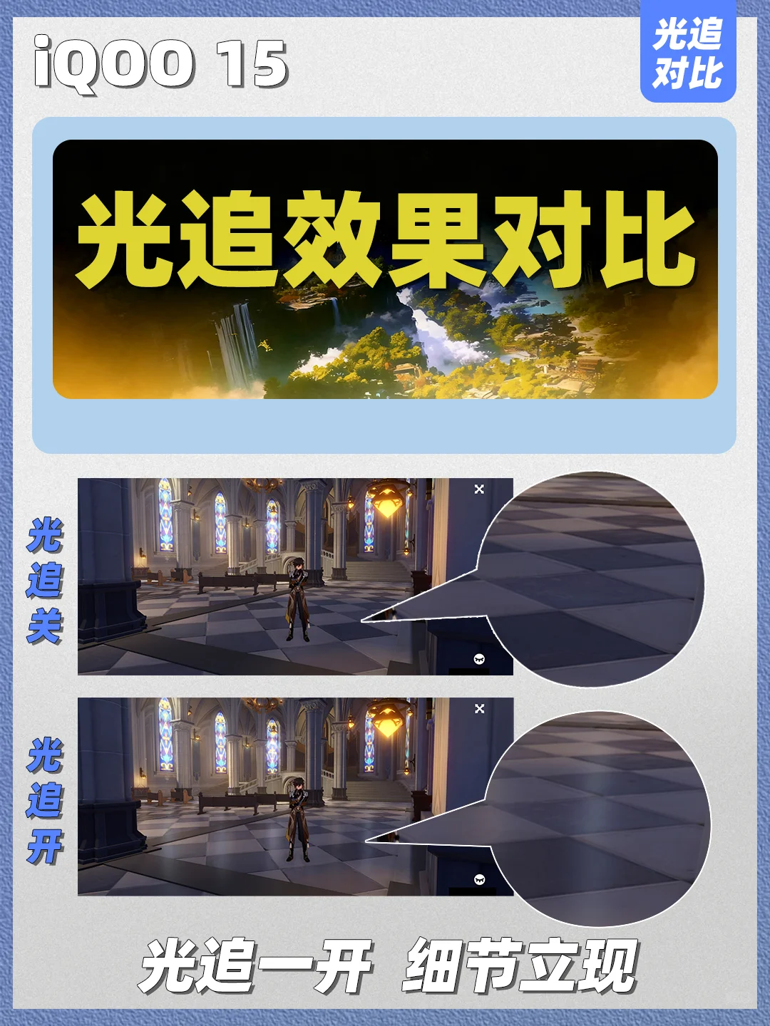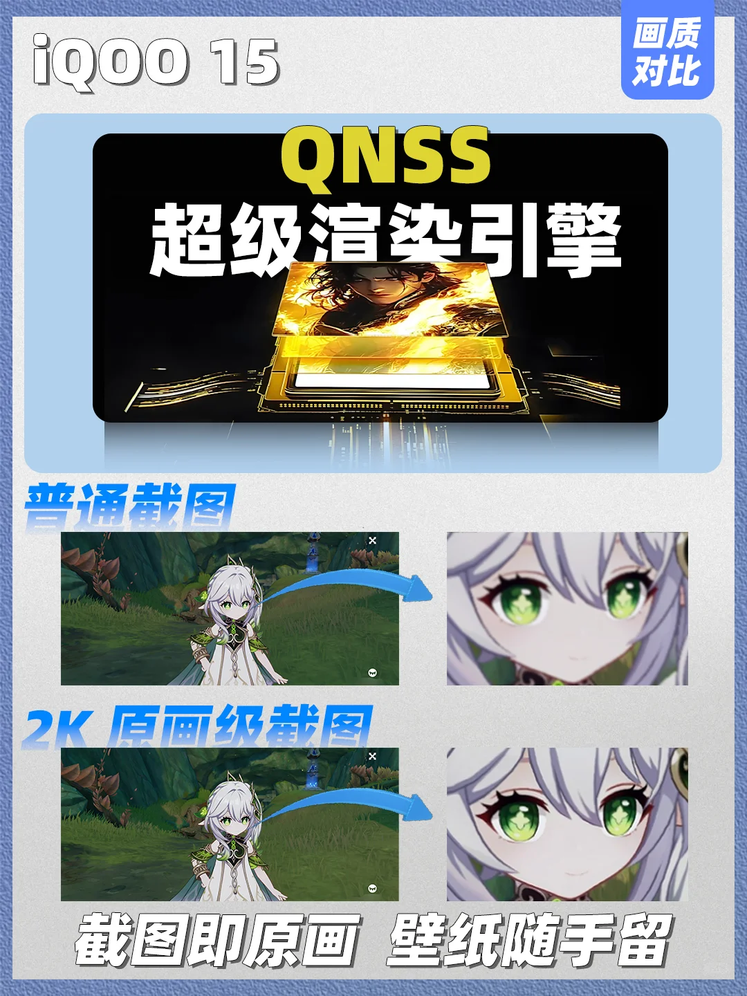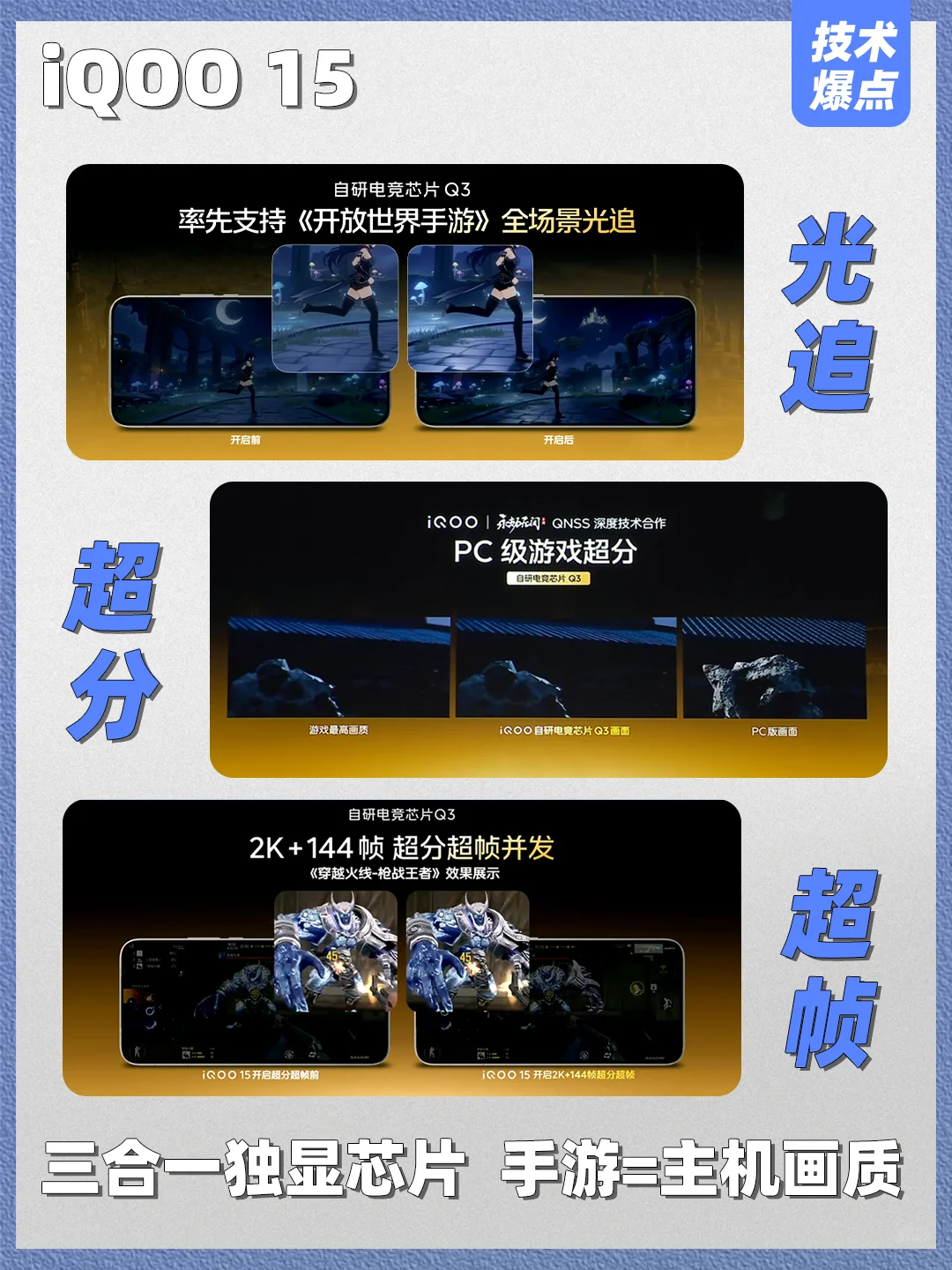 兄弟们,我承认——刚看到iQOO自研电竞芯片Q3的时候,我是带着怀疑的。 为啥?因为手游画质和主机差距还是有的。多少次打团,我手机先掉帧,结果团还没打完,人已经心态炸了。 结果没想到,被震惊到了。来,直接跟你们说重点! 首先是全场景光追。 以前我对手游光追的印象:要么开了卡成 PPT,要么效果寥寥无几。 这次iQOO 15率先实现了全场景自研光线追踪技术在手游上的落地,湖面倒影、火把亮度的细节,肉眼可见效果更细腻了。那一瞬间,我脑子里就闪过一句话——“哎?这不是我熟悉的手游画质啊”。虽然还是想倒放直播回去再确认下,但至少当时的直观感受,是比我想象中自然很多。 然后是全球首发QNSS超级渲染引擎。 说实话,现场讲到“QNSS 超级渲染引擎”的时候,我差点走神,感觉是很技术流的词儿。 但是效果还是很惊人的,只需要一半的性能开销,就能带来“翻倍”的性能和画质体验。 而且,用户不仅能体验到2K游戏画面,同时还可以截图出真2K原画。 演示一对比,差别就出来了:普通截图一放大,细节直接糊掉;而iQOO 15的截图,细节能留住,连远处的建筑线条都清清楚楚。 对爱分享游戏风景的人来说,这招算戳到点了。 不是空喊,而是我这种普通玩家能直接看出来的提升。 最让我意外的是 2K+144 超分超帧并发。 本来以为开这么高档位,手机肯定烫手、掉帧。结果现场演示的帧率曲线出乎意料地平滑,团队战斗场景也没有突然卡顿。 那种“稳”的感觉,其实比单纯的高分辨率更打动我。对手游玩家来说,画质好看是一方面,关键是不能掉链子。 看完直播,我的态度有点转变。 电竞芯片Q3不是凭空喊话“能替代主机”,而是确实把手游体验推近了一步。画质更真实、截图细节更丰富、高档位也能稳。对我这种常年打手游的人来说,它解决的是“用得爽不爽”的问题。 要是你和我一样经常冲排位、爱欣赏游戏风景,那这款搭载自研电竞芯片Q3的iQOO 15,确实值得去期待下。