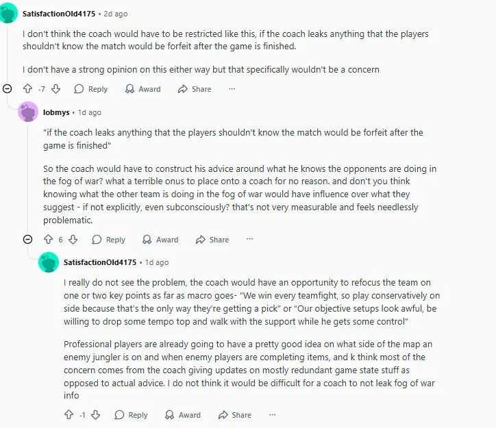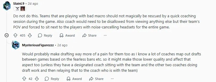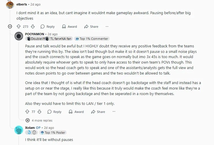 (比赛中)暂停下来去讨论会很糟糕,但我非常怀疑,他们在向队伍们征求这个想法的意见时,能收到什么积极的反馈。不过这个想法并不坏,但让它不暂停,而是播放一个小噪音,教练在游戏正常进行时连接并讲话,但我认为3次45秒太多了。绝对需要让发言者只能访问自己团队的视角。这样,主教练可以发言,其中一位助理/分析师可以获得完整的视角,并记下比赛之间的要点,并且两人不得交谈。