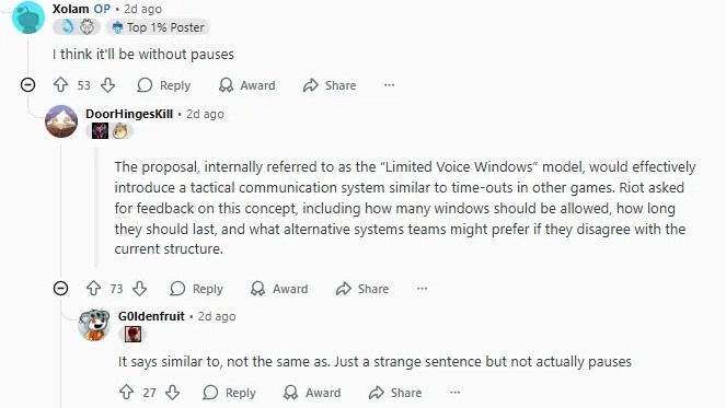 "这项在内部被称为“有限语音窗口”模型的提案,实际上将引入一种类似于其他游戏中暂停的战术沟通系统。Riot征求了对此想法的反馈意见,包括应允许多少个窗口,它们应持续多长时间,以及如果团队不同意当前结构,他们可能更喜欢哪些替代系统。"