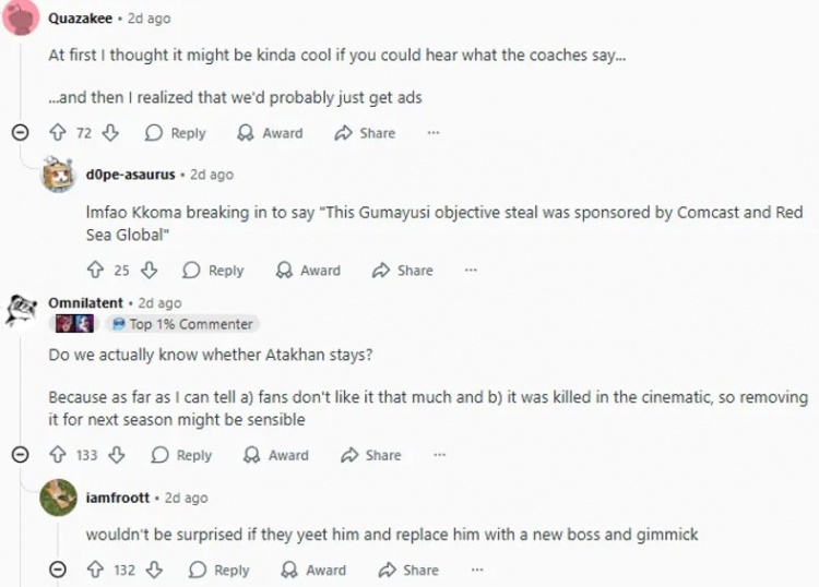 我不禁觉得这不可避免地会在收到粉丝的糟糕反馈后被取消,不过看到教练们在一个赛季里拼命恳求他们的队伍不要在厄塔汗时候送人头肯定会很有趣。