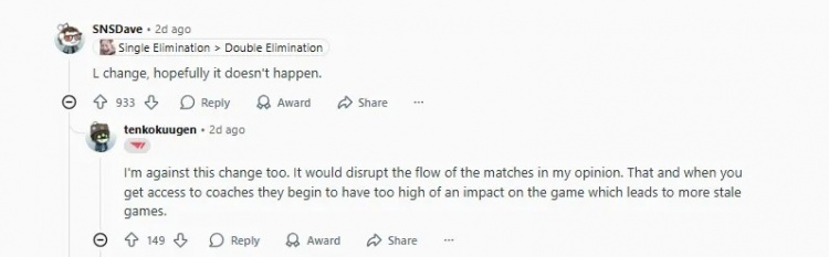 这可能会让他们在bp方面更加痛苦,因为我知道很多教练会在比赛之间根据无畏征召情况来规划选角,所以这可能会降低质量,影响这方面(除非他们有一个指定的教练和队伍坐在一起,另外两个教练做bp工作,然后将信息传递给和队伍在一起的教练)。