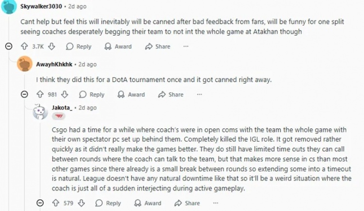 CSGO曾经有一段时间,教练可以在整个比赛过程中与队伍进行公开交流,他们的观众电脑就设置在队伍身后。这完全扼杀了IGL的角色。由于这并没有真正让比赛变得更好,所以它很快就被移除了。他们仍然可以调用有限的暂停时间,教练可以在回合之间与队伍交谈,但这在CS中比大多数其他游戏更有意义,因为回合之间已经有一个短暂的休息时间,所以将其中一些时间延长为暂停时间是很自然的。英雄联盟没有任何像这样的自然停顿时间,所以教练突然在活跃的游戏过程中插话会显得很奇怪。