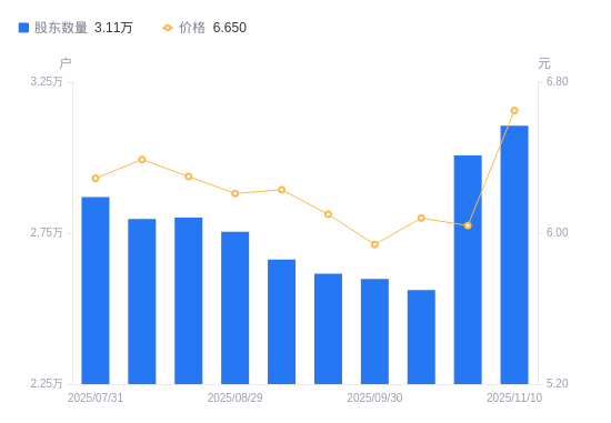 近一年(2024年11月20日至2025年11月10日),长青股份A股股东户数从2.5万户,增加至3.11万户,增幅24.08%,区间股价上涨27.64%。