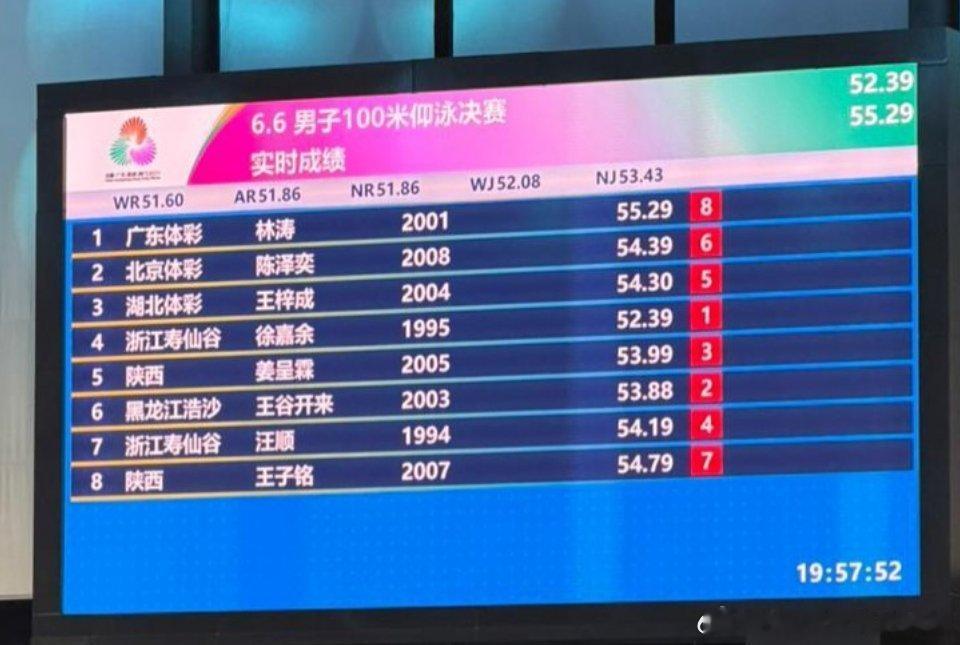 第十五届全运会游泳 第6场男子100米仰泳 决赛浙江 54.19获得第4浙江徐嘉余🥇 黑龙江王谷开来🥈 陕西姜呈霖🥉