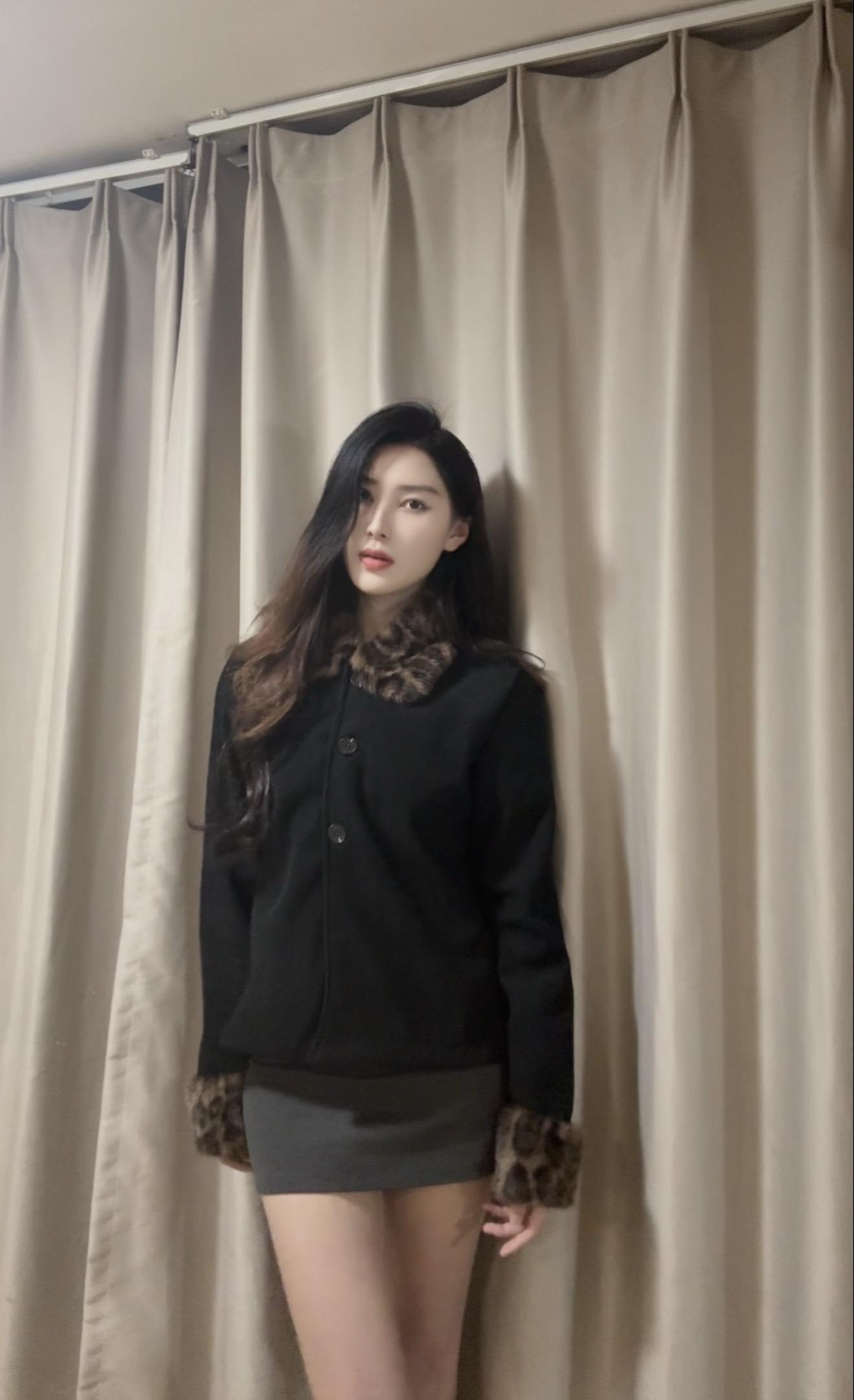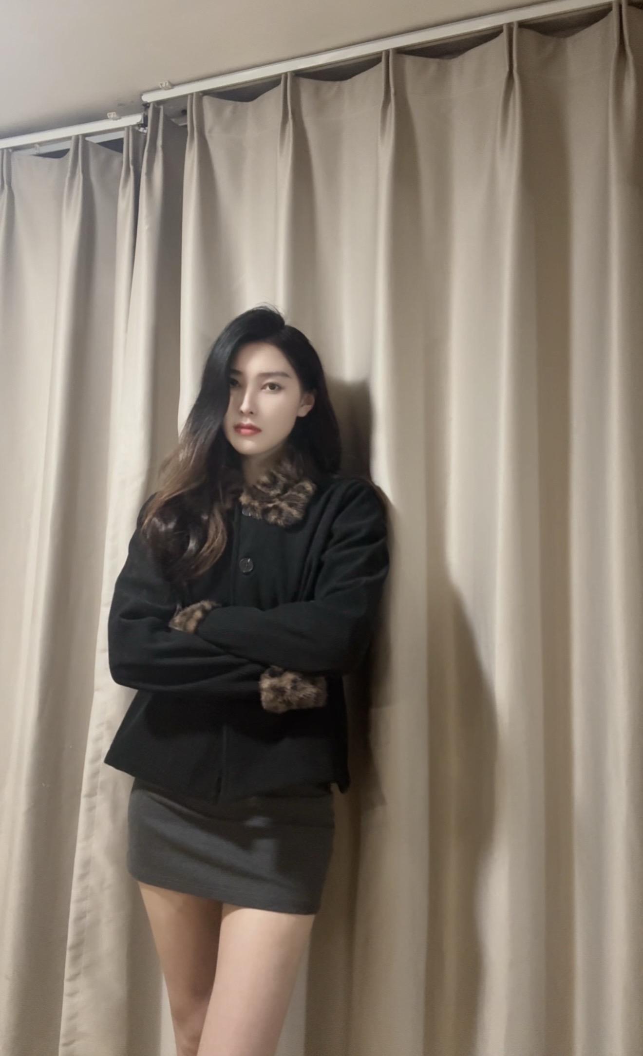 灰绿色针织上衣配黑色牛仔短裤,时尚又简约。Gucci包与灰色凉鞋,尽显潮流品味。