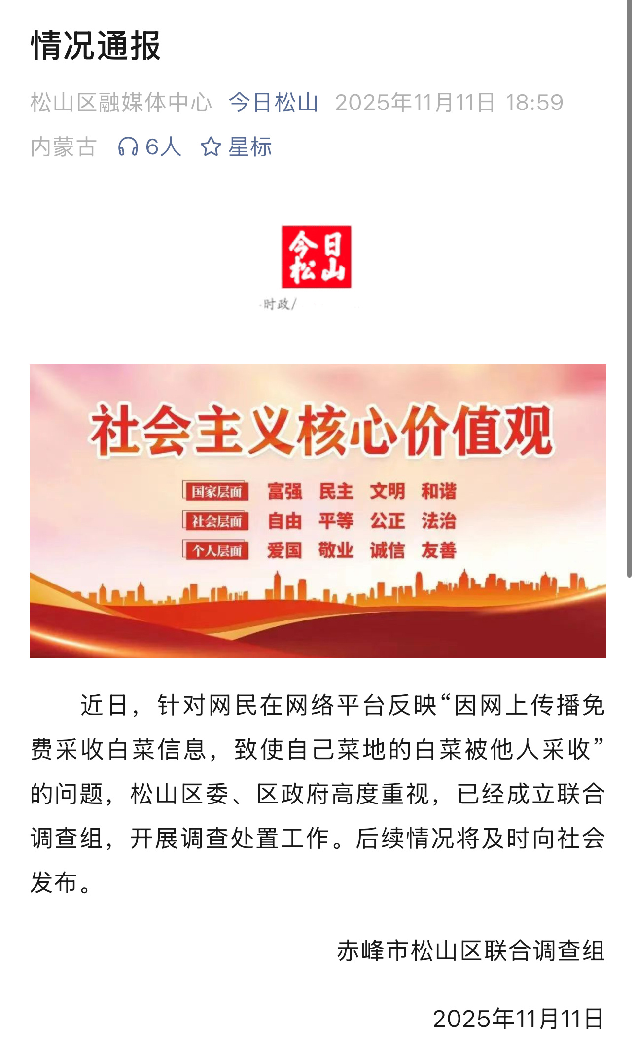 松山成立了调查组,要对“因网上传播免费采收白菜信息,致使自己菜地的白菜被他人采收”的事件进行调查那么我想知道,做出这类报道的红山晚报小编莫小萌会在这起事件里面担责吗?