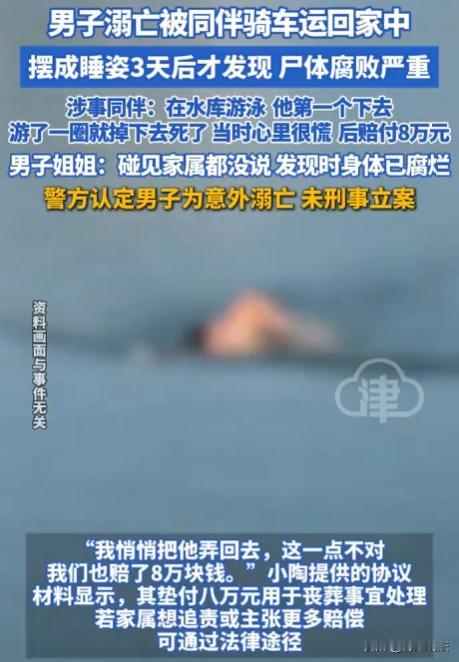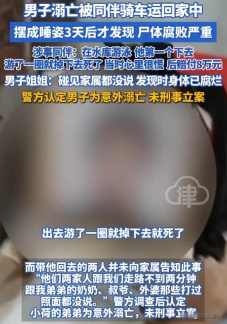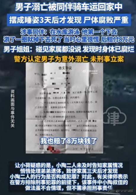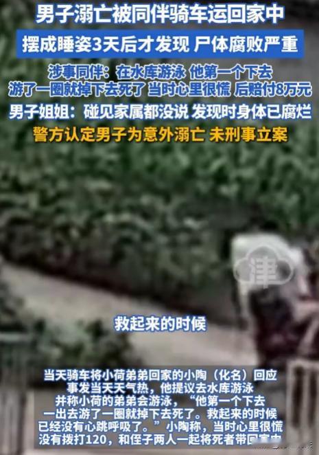 四川自贡,小荷说弟弟在家离世,当时气温高,尸体都腐败严重了。调监控发现,弟弟是被同村叔侄俩骑车带回家,之后就没再出门,可这俩人没跟家属说。警方认定是意外溺亡,没刑事立案。这叔侄俩为何不告知家属呢? (来源:荔枝新闻、观威海) 据悉,小荷(化名)一家住在富顺县的小村子里,平时邻里关系说不上多亲密,但也没什么大矛盾。 9月7日,小荷回家,一进门就闻到一股怪味,再一看,弟弟躺在屋里,尸体已经腐败。 她当时就懵了,赶紧报了警。 小荷想起家里有监控,民警来后,赶紧查看,这一看可不得了。 监控显示,9月4日弟弟被同村的叔侄俩骑车带回了家,之后弟弟就再也没出过门,这叔侄俩为什么不跟家里人说一声呢? 原来,9月4日那天,小陶(叔侄中的叔叔)提议去水库游泳,还说小荷弟弟会游。几个人到了水库,弟弟下水后没多久就出了意外,溺亡了。 小陶说,当时他一下子就慌了神,根本没想到打120。他和侄子一商量,就把弟弟带回了家。 回到家后,小陶心里也害怕,不知道该怎么办。 后来,他主动找到小荷家,赔了8万丧葬费。 可这8万块钱,能弥补小荷一家失去亲人的痛苦吗? 小荷觉得,这叔侄俩的做法太过分了,不仅没及时告知家属,还没采取正确的救助措施。 经过详细调查,认定这是一起意外溺亡事件,没有刑事立案。 这让小荷一家更难以接受,他们觉得这叔侄俩肯定有问题,不然为什么不早点说呢? 这事儿一传开,村里人也议论纷纷。有人说这叔侄俩太不地道,出了事还瞒着;也有人说,可能是当时太慌张,没顾得上。但不管怎么说,小荷弟弟的命没了,这是无法改变的事实。 有律师认为:警方都排除了刑事犯罪,那小陶叔侄做法虽不合情理,但不用担刑事责任。现有法律没对意外事件设严格的最后救助人义务。 据《刑法》规定,构成犯罪得有故意或者过失。 小陶提议去游泳,并不是想害死小荷弟弟,不存在故意犯罪的情况。 那过失呢? 过失犯罪,是指应当预见自己的行为可能发生危害社会的结果,因为疏忽大意而没有预见,或者已经预见而轻信能够避免。 小陶说当时慌了,没打120。 他可能确实因为意外发生而惊慌失措,难以认定他有疏忽大意或者过于自信的过失。 所以,从刑法看,很难认定小陶叔侄构成犯罪,警方不刑事立案也是有道理的。 虽然现有法律没对意外事件设严格的最后救助人义务,但这叔侄俩要是因为行为给家属造成了情感伤害,可能会有一定的抚慰赔偿义务。 不过,从现有证据来看,很难论证出他们涉及刑事责任。 小陶叔侄把溺亡的人带回家,这种行为是不是违法呢? 《民法典》规定,行为人因过错侵害他人民事权益造成损害的,应当承担侵权责任。 小陶叔侄带弟弟去游泳,弟弟溺亡,他们有一定过错。 但他们已经赔了8万丧葬费,这在一定程度上是对过错的一种弥补。 如果小陶叔侄当时打了120,结果会不会不一样呢? 及时救助,可能会减少损害后果的发生。 在该事件中,即使打了120,也不能保证弟弟一定能救回来。 不过,及时救助是每个公民应有的道德义务,不构成刑事责任。 最终,警方认定是意外溺亡,未刑事立案。 在生活中,要时刻注意安全,尤其是在进行一些有风险的活动时,一定要做好防护措施。遇到意外情况,要保持冷静,及时采取正确的救助措施。 信源: 男子溺亡后被同伴运回家中摆成睡姿,3天后才发现,遇难者姐姐:碰见家属都没说,发现遗体时已腐烂 2025-11-12 20:14·观威海