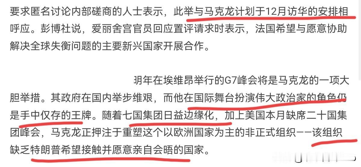 特朗普提出G2之后,法国总统马克龙明显有点坐不住了!外媒曝光,马克龙正在筹划一个大计划,邀请中国出席G7会议!11月13日,美国彭博社称,马克龙拟邀请中国参加明年七国集团峰会,G7峰会明年将在法国举行,外媒称法国已经与一些盟友讨论过这一想法。为什么马克龙有此计划呢?这主要有两方面的原因。 其一,法国政府在国内举步维艰,而外交是法国发挥影响力的仅存的王牌,这有助于提升法国在国际事务中的重要性。其二是,外媒直言不讳的表示,G7集团日益边缘化,加上美国本月缺席G20集团峰会,特朗普缺乏出席G7的动力,法国希望以此增加特朗普出席的概率。 事实上,外媒透露称,马克龙12月份有访华计划,在访华期间,马克龙有可能当面作出这样的邀请。当然,从法国的角度而言,法国确实有动机这样做。但是,中国出席G7会议的概率非常低。从G7会议的架构来看,该组织是一个富国俱乐部,与我们坚定的站在广大南方国家的定位不符。并且,长期以来,西方国家通过该组织占据话语权,在俄乌战争,供应链等问题上一而再的表达对华不友好的立场。 该组织缺乏与我们合作的议题,如果我们出席,这事实上就是给法国抬轿子,我们并不感兴趣与G7同坐在一张桌子上。很显然,法国的构想,这充分说明一点,中国的影响力越来越大,法国也明白关键性的问题根本不可能绕过中国,加之美国现在不止一次提及G2,这让一贯与美国站在一起,认为掌握全球主导权的欧洲,有一种极大的失落感。马克龙有意以中国撬动法国及欧洲影响力,但这样的构想,不太可能实现,也不能解决欧洲面临的根本性问题。