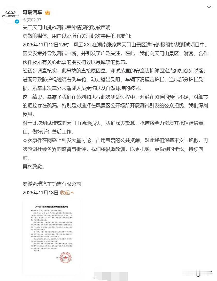 奇瑞凌晨致歉! 奇瑞汽车在天门山测试发生意外之后,他们在凌晨2:00过发出来,
