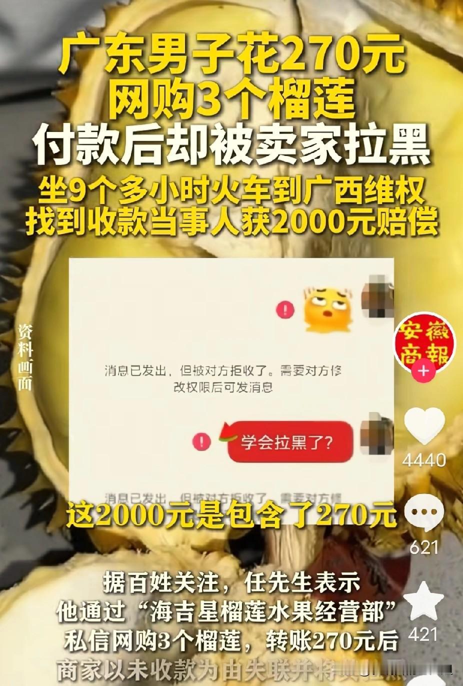 “是个狠人!”一男子花270元网购3个榴莲,转账成功后被卖家拉黑。一气之下便和女友从广东阳春坐9个多小时火车到广西南宁维权。 ​南宁江南区水果批发市场的榴莲摊前,任先生捏着刚剥开的金枕榴莲果肉,糖心顺着指缝淌下。 任先生能追回钱款,关键一步是发现了收款方竟是家“八方来财烧烤店”,并通过其他受害者提供的商户地址定位到南宁具体位置。这种私下转账的购物方式本就风险极高,商家拉黑买家后通常难以追责。任先生的“狠”其实是被逼出来的——他发现连同自己在内共有5人被骗,其中两人直接放弃,觉得为两百多块钱不值当折腾。 普通人维权成本之高,让多数人只能吃哑巴亏。对比常规维权渠道,任先生的跨省追击更像是个无奈的特例。通常消费者遇到问题,可以先尝试与商家协商,或向电商平台投诉。如果解决不了,还可以拨打12315热线或通过全国12315平台向市场监管部门投诉,后者应在7个工作日内决定是否受理。实在不行,还能提起诉讼,但这对于小额纠纷来说,成本往往远超纠纷金额本身。任先生的经历恰恰说明,现有机制对普通小额消费者仍不够友好,维权的时间、精力和经济成本让很多人望而却步。 这件事最值得玩味的是维权结果的“不对等”。任先生最终拿回了270元货款并获得了2000元赔偿,这依据的是《消费者权益保护法》中关于欺诈行为三倍赔偿的规定(不足500元按500元算)。而烧烤店用水果店名头行骗,属于典型欺诈。但若非任先生如此执着,结果很可能就不了了之。这种依赖个人“狠劲”才能实现的正义,反衬出日常消费环境中常规维权渠道效率的不足。 任先生的成功像个偶然事件,照亮了消费维权的灰色地带。他的行动证明,保留证据(如转账记录、聊天截图)并敢于追究至关重要。倘若消费者都能积极维权,商家欺诈的成本就会大幅提高。 各位读者你们怎么看?欢迎在评论区讨论。