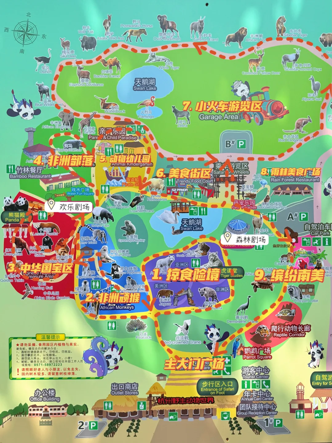 掠食险境→ 非洲顽猴→ 中华国宝区→ 欢乐剧场→ 非洲部落→ 亲子乐园→ 动物幼儿园→ 美食街区→ 雨林美食广场→ 森林剧场→ 缤纷南美
