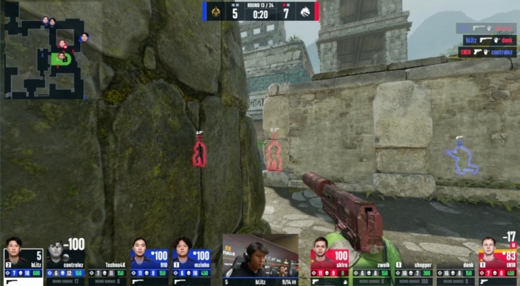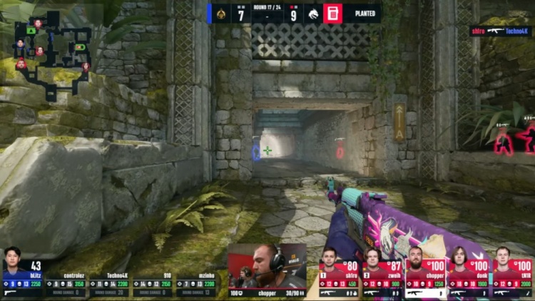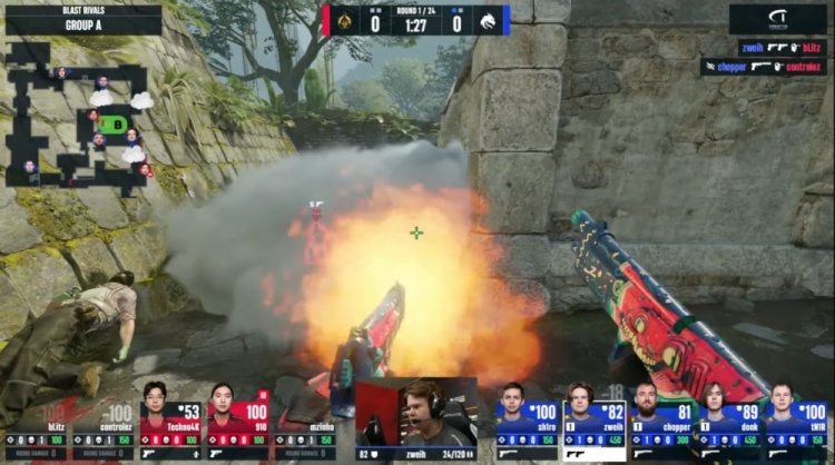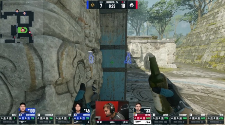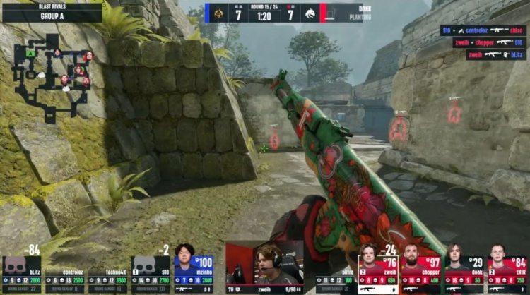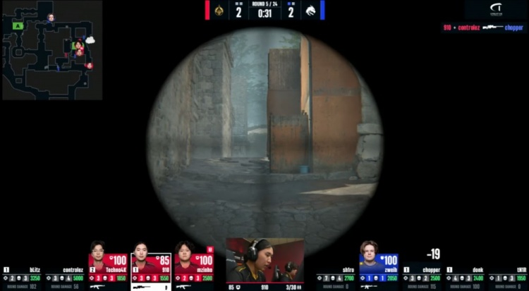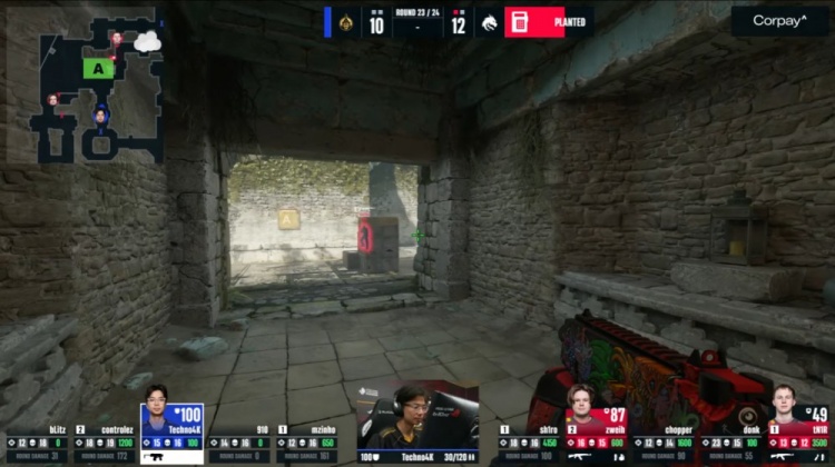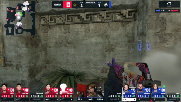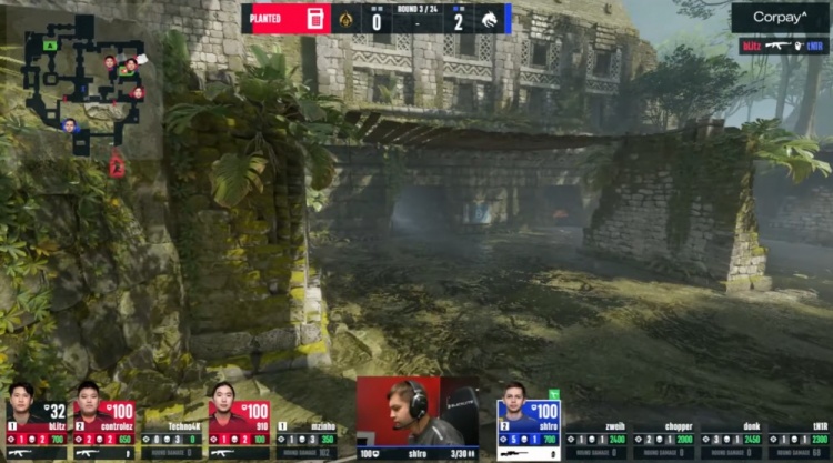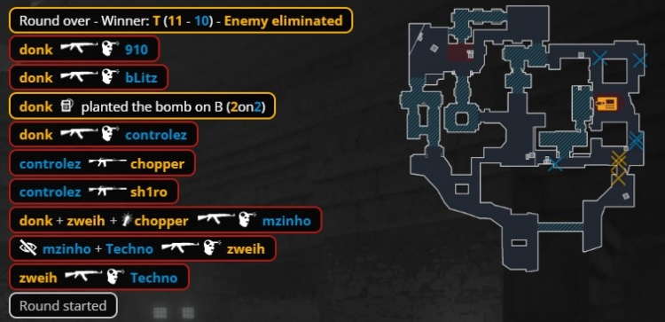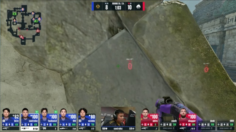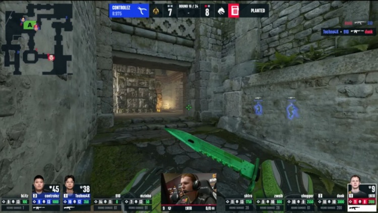 第18回合蒙古暂停回来,中路donk前顶换掉bLitz,zweih击杀910,绿龙慢打B点,controlez看B长廊击杀chopper,4k逮捕zweih,残局2v2,sh1ro与tN1R带包返回B点,controlez双杀sh1ro与tN1R,单局三杀,蒙古8-10绿龙。