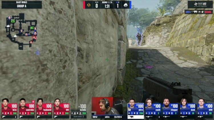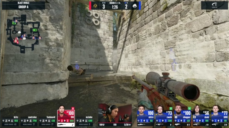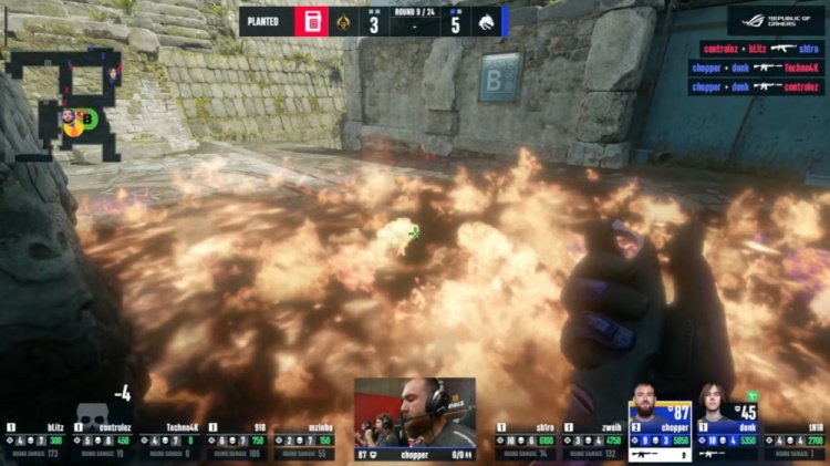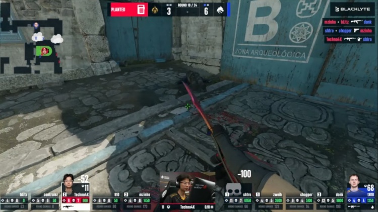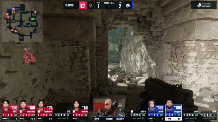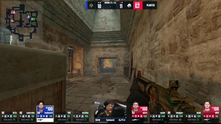 第4局中路sh1ro配合donk反清击杀910,但sh1ro与donk均被击杀,mzinh摸到A大击杀tN1R,bLitz轻松在A下包,chopper没钳子看了半天C4不敢拆包撤退,蒙古2-2绿龙。