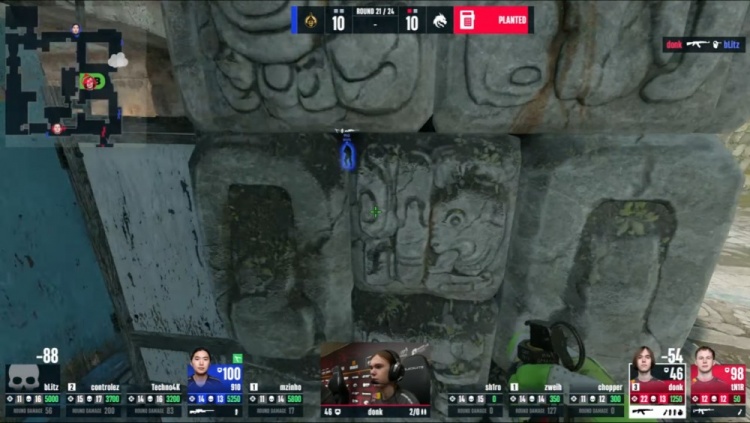 第21局回到长枪,绿龙继续四人带包来B,donk进B双杀,controlez反手双杀被换,donk在B下包,bLitz回防被donk击杀,donk单局四杀,蒙古10-11绿龙。