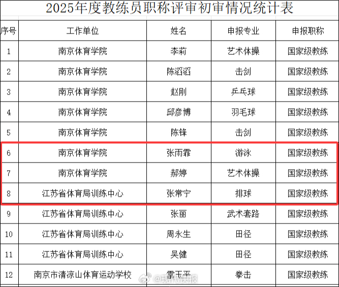 第十五届全运会正在粤港澳大湾区举行,日前,江苏省体育局人事处发布了《2025年体育专业人员职称申报人员名单评前公示》。在《2025年度教练员职称评审初审情况统计表》中,张雨霏拟评为游泳国家级教练,张常宁拟评为排球国家级教练,郝婷拟评为艺术体操国家级教练。