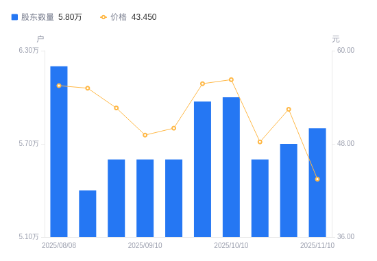近一年(2024年11月20日至2025年11月10日),鼎捷数智A股股东户数从3.8万户,增加至5.8万户,增幅52.63%,区间股价上涨62.61%。