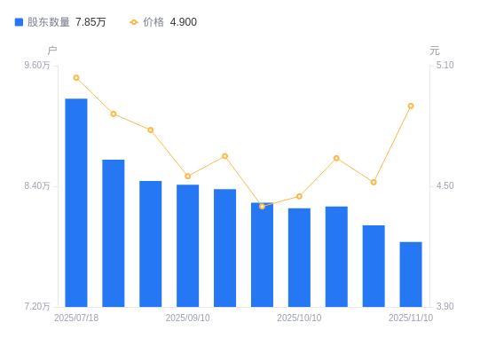 近一年(2024年11月29日至2025年11月10日),凤凰航运A股股东户数从9.04万户,减低至7.85万户,降幅13.24%,区间股价下跌7.02%。