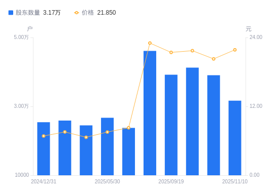 日期A股户数(户)流通A股户均持股数(股)户均持股市值(万元)2025-11-103165815067.4632.922025-10-203905812212.7524.762025-09-304126511559.5725.082025-09-193918811344.5124.282025-08-20460999519.2521.922025-06-302374516693.0613.812025-05-302668314843.9511.182025-03-312448716175.1610.712025-03-202589415296.8811.552024-12-312539315598.6910.67