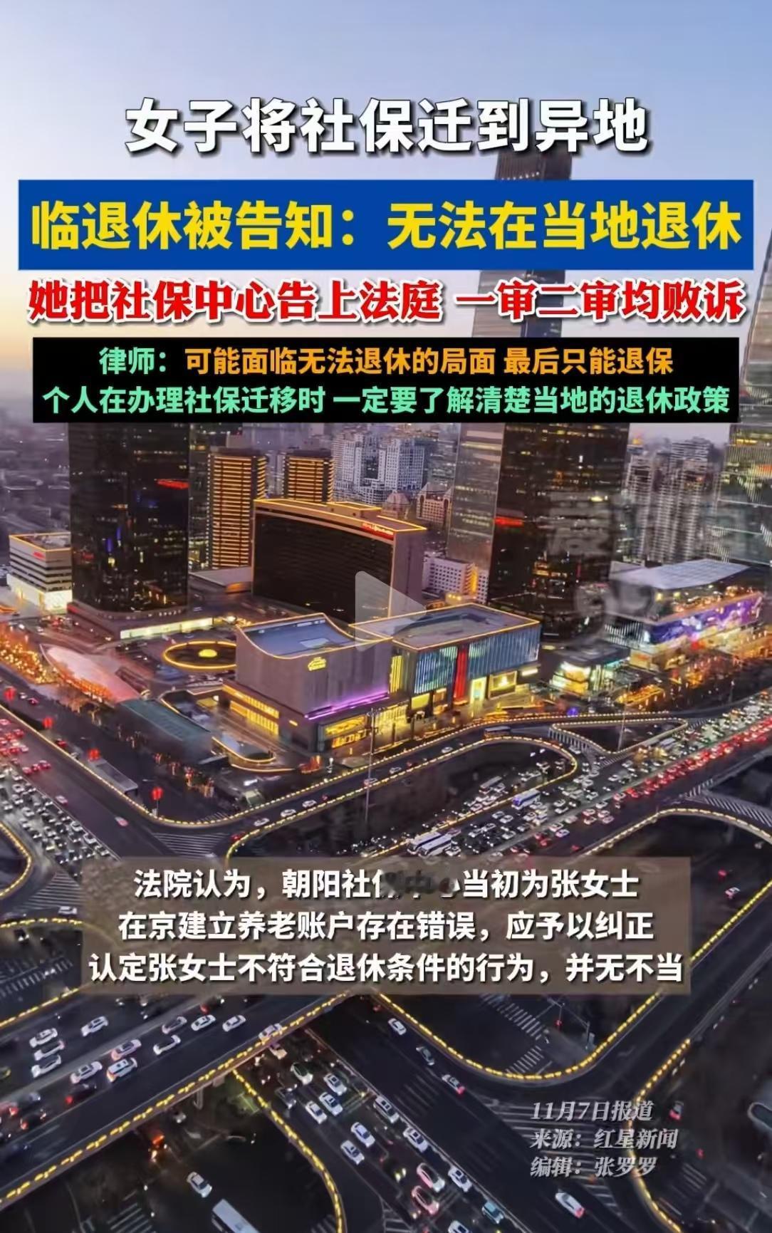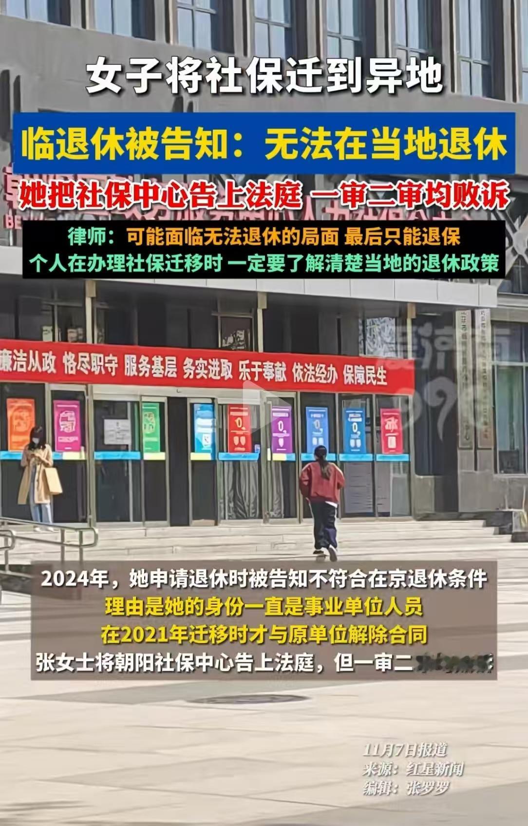 女子异地交15年社保,临退休被告知不能当地退,评论区网友炸锅。 北京,张女士在北京生活了十几年,最近却遭遇了一件让他最糟心的事! 原来张女士的老家是昌黎,之前她在昌黎一家房地产事业单位供职。 曾经她以为,拥有编制的岗位能让她一生安稳,无需忧虑未来的就业问题。 然而现实却未能如愿,就在2001年,因单位经营陷入困境、难以继续维持,张女士跟单位签了长期放假协议。 协议规定,单位每个月给他发放120元生活补贴金,并且张女士的养老保险,由单位工会替她购买。 于是,张女士大胆决定外出打工,最终她在北京找到了工作。 2009年,张女士在北京开设了养老保险账户,并开始在当地缴纳养老保险费,这一缴就是十多年。 直到2021年,张女士临近退休年龄,她特意前往北京市朝阳区,社会保险基金管理中心进行咨询。 得知在北京缴纳养老保险,满十年后,是可以在北京办理退休手续的。 这一消息令她兴奋不已,因为若能实现在北京退休,她每月可领取的养老金,将比在原单位退休高出不少。 张女士心里美美的,她甚至还规划出在北京退休,然后退休后拿着北京的养老金,去参加各种老年书法班,和跳广场舞的精致退休生活。 于是她立即返回昌黎县,与原事业单位办理解除劳动关系的手续,并申请将社保关系转移至北京。 由于张女士曾在一段时间内,存在两地重复缴纳养老保险的情况,昌黎县社保部门也将重复缴纳期间的养老保险费用退还给了她。 在拿到社保转移接续联系函的那一刻,张女士心中悬着的石头总算落了地,认为在北京办理退休已是十拿九稳的事。 然而,她万万没想到,2024年,当她达到法定退休年龄,正式向社保中心申请在京退休时,却被告知,她不满足在北京退休的资格,无法在北京退休。 得知这个消息,张女士如当头一棒,直接懵了!自己的社保,明明已经从昌黎转到了北京。 而且在北京,从2009年到现在开始,她也交了15年的社保了,为啥不能享受在京退休的资格呢? 社保中心解释,根据相关政策,非户籍地女性参保人员超过40周岁后新参保的,只能建立临时基本养老保险缴费账户。 而此类临时账户的参保人员,是不符合在临时账户所在地办理退休的条件的。 张女士无法接受,自己已在北京连续缴纳养老保险十多年,账户状态一直显示为非临时账户。 而且2021年,她在办理转移手续前,曾专门咨询过社保中心,得到肯定答复后才着手办理相关手续,为何如今突然被告知不符合条件? 如果确实不符合政策要求,当初提交转移申请时,社保中心理应拒绝受理。 北京朝阳区社保基金管理中心告诉张女士,她因为不满足在京退休的资格,所以他要么在原昌黎户籍地退休,要么只能退保。 可现在他已经把社保转到了北京,也就是说他在原户籍地也无法享受退休。 这样一来,张女士就要面临无处可退的尴尬局面。 而且要么只退保,也有可能只退个人缴纳的那一部分,这么多年白缴纳了。 2024年,无奈的张女士向法院提起行政诉讼,请求撤销朝阳社保中心作出的不予退休决定,并要求其依法为她办理在京退休手续。 《社会保险法》第十六条:参加基本养老保险的个人,达到法定退休年龄时累计缴费满十五年的,按月领取基本养老金。 张女士已缴纳养老保险15年,符合最低缴费年限要求,但退休资格还需结合户籍和参保账户类型判断。 《城镇企业职工基本养老保险关系转移接续暂行办法》(国办发〔2009〕66号)第五条:女性年满40周岁后首次在非户籍地参保的,应建立临时基本养老保险缴费账户,退休时需转回户籍地或最后参保地(缴费满10年)办理退休。 张女士2021年超过40周岁,从昌黎县转移社保至北京时,因已超过40岁。 北京社保系统可能将其账户认定为临时账户,导致无法在北京退休。 判决结果一审、二审张女士均败诉。 1、为何张女士无法在北京退休? 根据上述条款,非户籍地女性超过40岁后,新参保或转移社保,只能建立临时账户。 张女士2021年转移社保时已超过40岁,北京社保中心,按规定将其账户设为临时账户,而临时账户不能作为退休地。 张女士在2009年,未超40岁已在北京参保,但2021年转移社保时,因与原单位解除劳动关系,可能被重新认定为“首次参保”,触发临时账户规则。 即使她在北京累计缴费满15年,因账户性质为临时,仍需转回户籍地,或最后缴费满10年的地区退休。 但她已将社保转移至北京,导致昌黎也无法办理退休,陷入“无处可退”的困境。 2、为何法院判决张女士败诉? 法院仅审查行政行为的合法,不直接干预政策制定。社保中心依据规定,作出决定,程序合法,法院因此维?持原判。 对此,网友炸锅了!大家纷纷同情张女士的遭遇,因为这样的退休事件,养老待遇,跟每个人的利益都息息相关。 张女士的遭遇,也是大家日后可能会面临的个人问题。 难道,迁移时,原社保原单位没有告之的义务吗? 对此你怎么看。