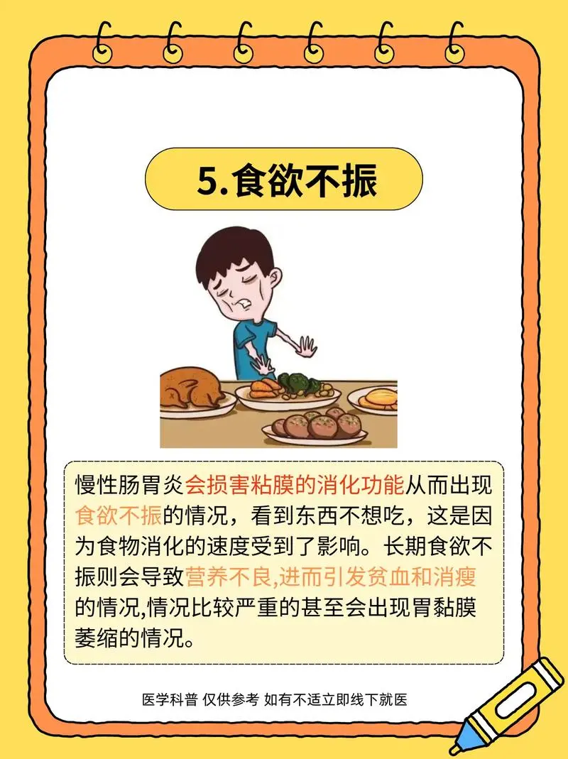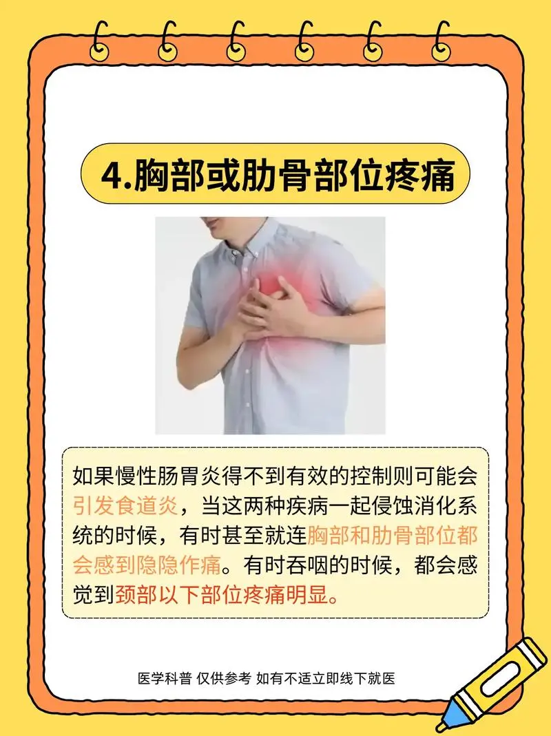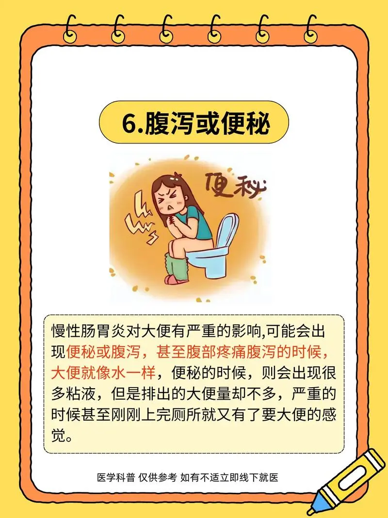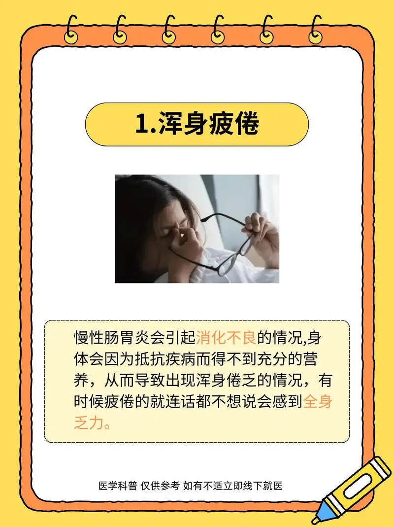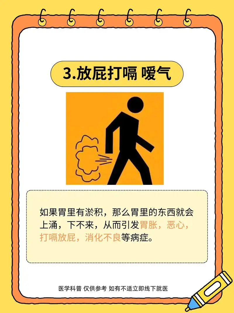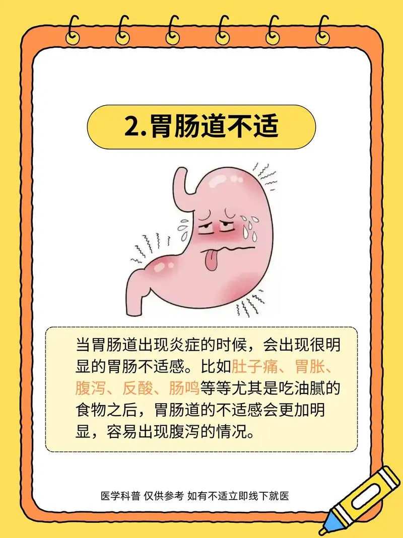 1.浑身疲倦 2.胃肠道不适 3.放屁打嗝嗳气 4.胸部或肋骨部位疼痛 5.食欲不振 6.腹泻或便秘