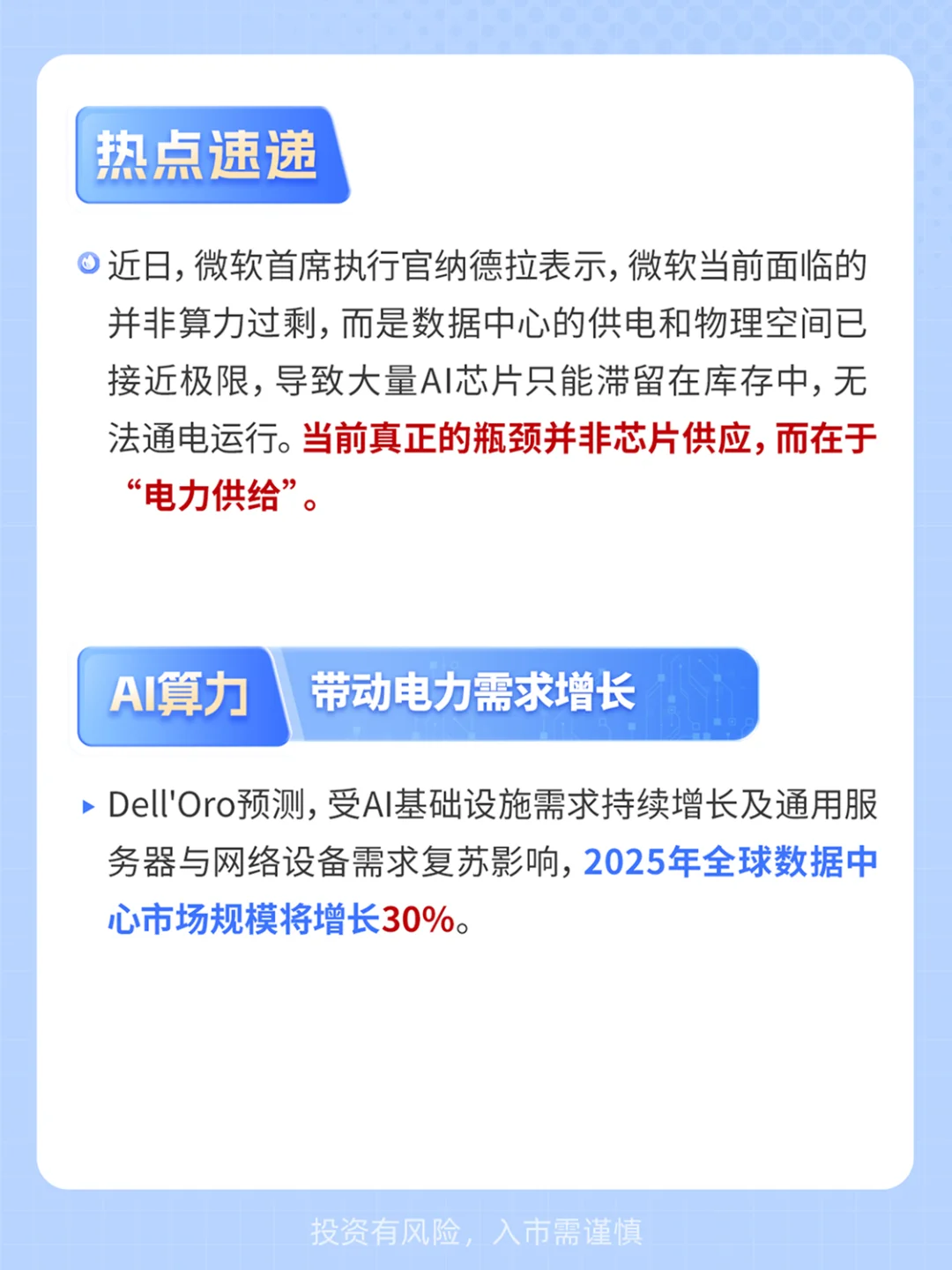 💬近日,微软首席执行官纳德拉表示, 💻微软当前面临的并非算力过剩, ⚡️而是数据中心的供电和物理空间已接近极限, 👉导致大量AI芯片只能滞留在库存中,无法通电运行。 💡当前真正的瓶颈并非芯片供应,而在于“电力供给”。