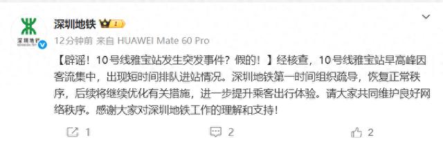 深圳地铁辟谣:10号线雅宝站发生突发事件?假的!